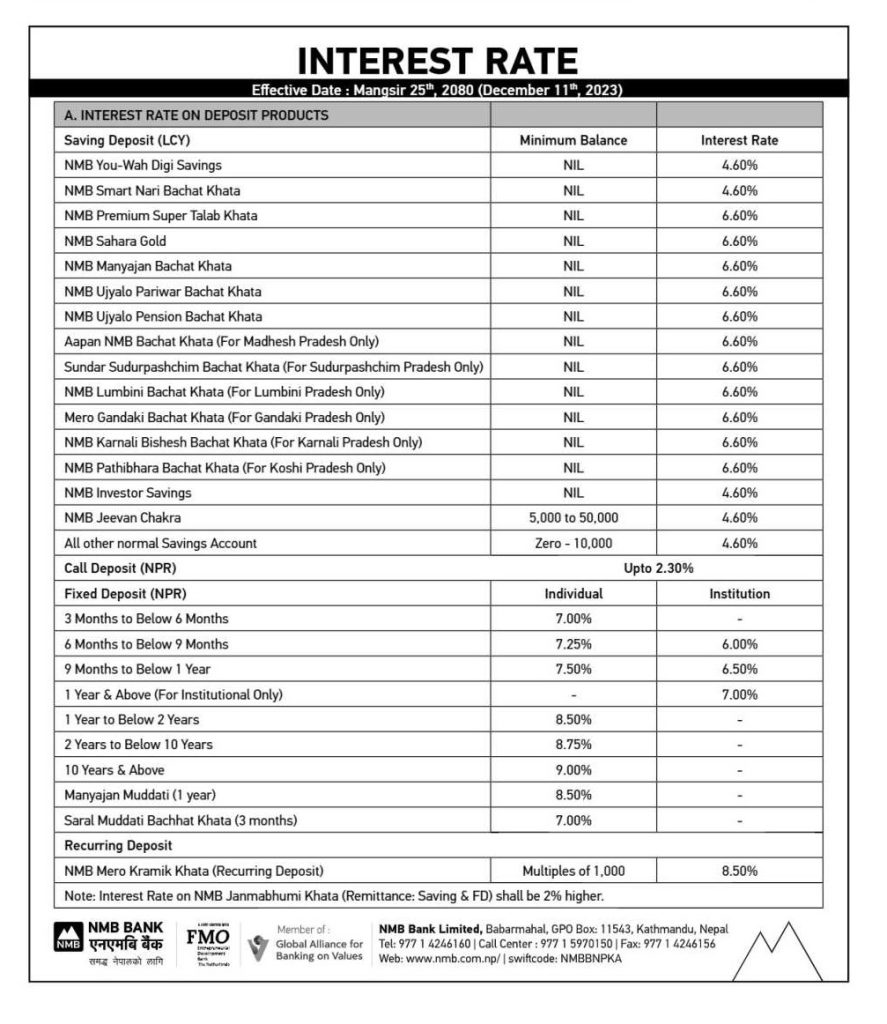 यसअघि व्यक्तिगत मुद्दति निक्षेपमा ९.५० प्रतिशत ब्याज रहेको थियो । बैंकले बचतमा ४.६० देखि ६.६० प्रतिशतसम्म ब्याज दिने जनाएको छ ।