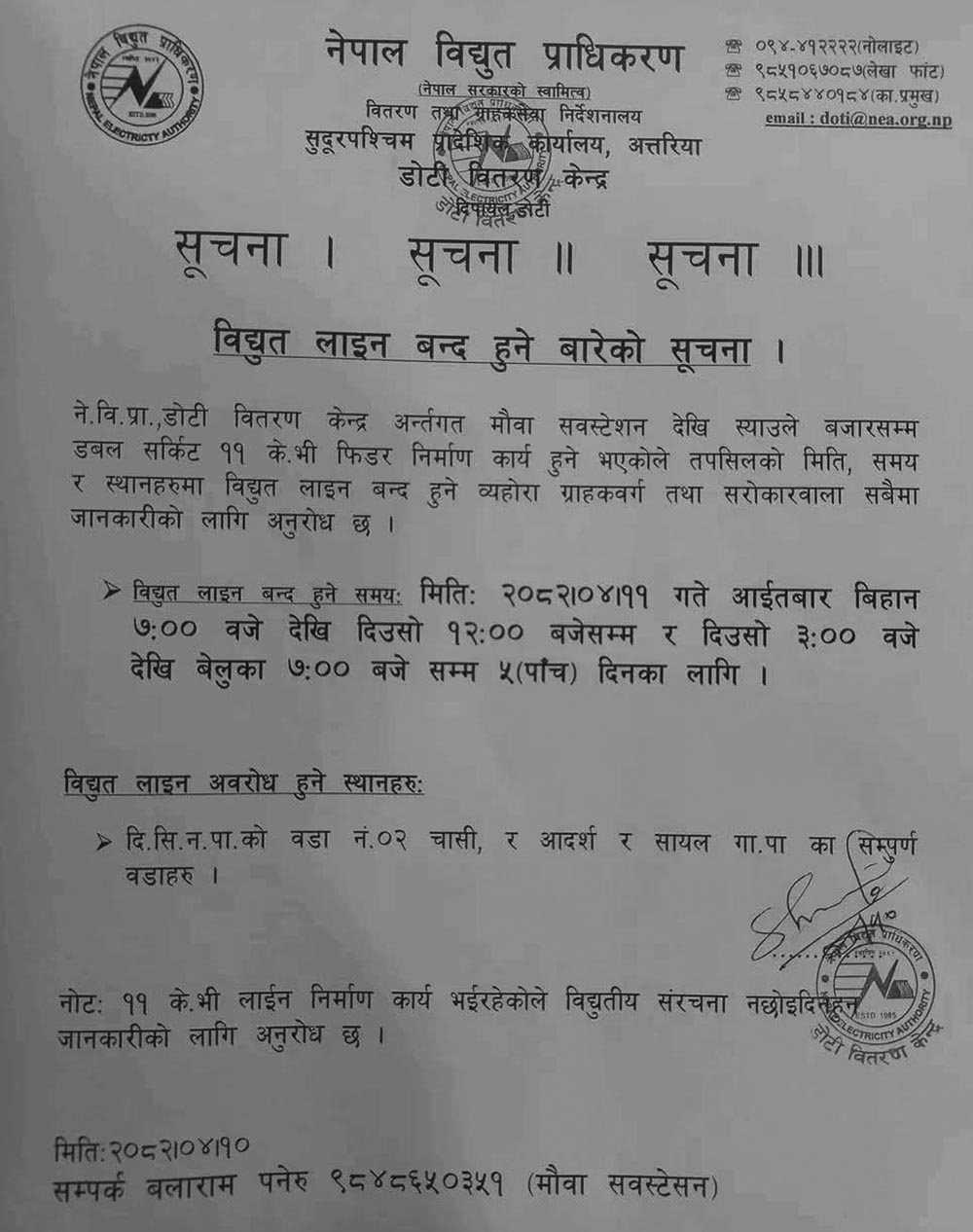 डोटी वितरण केन्द्रले सुचना प्रकाशित गर्दै पाँच दिनसम्म बिहान ७ देखि १२ र दिउँसो ३ देखि ७ बजेसम्म विद्युत् अवरुद्ध हुने जानकारी दिएको हो ।