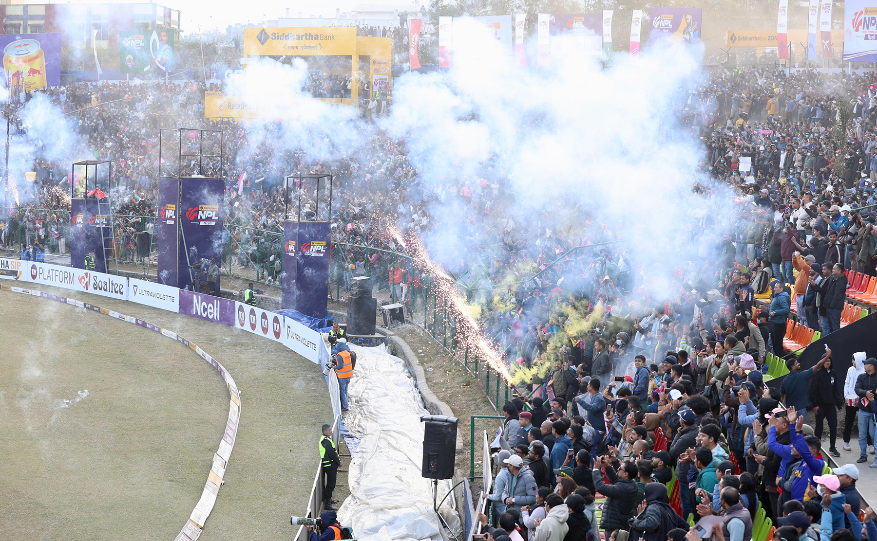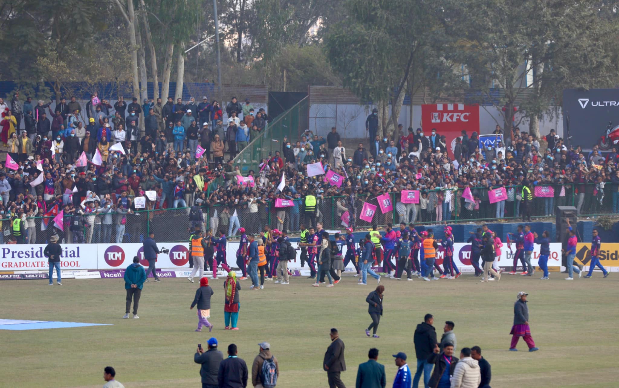 जनकपुरको जितपछि समर्थक त्रिवि क्रिकेट मैदानमा उत्सव मनाइरहेका छन्।