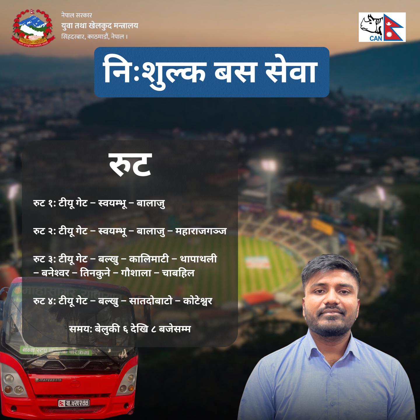 निःशुल्क बससेवाका लागि मुस्कान ट्राभल्ससँग सहकार्य गरिएको छ । मन्त्री गुप्ताका अनुसार यो सेवा आजदेखि खेल अवधिसम्म बेलुकी ६ देखि ८ बजेसम्म उपलब्ध हुनेछ ।