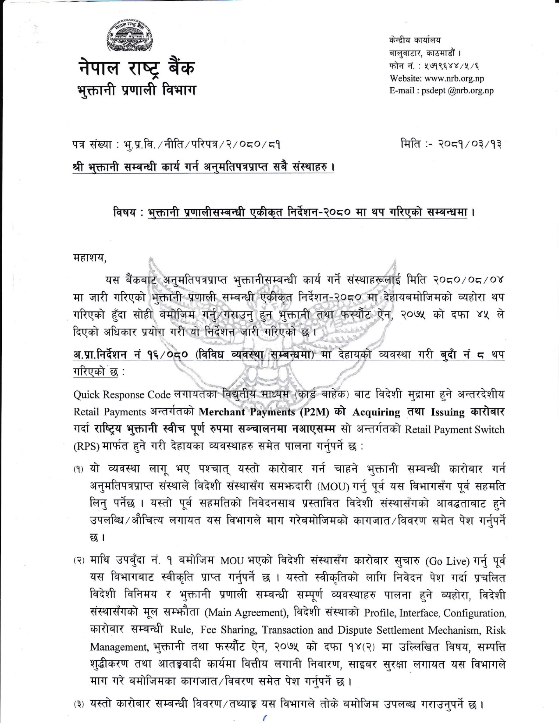 राष्ट्र बैंकले बिहीबार भुक्तानी प्रणाली सम्बन्धी एकीकृत निर्देशन २०८० जारी गर्दै यस्तो व्यवस्था गरेको हो ।