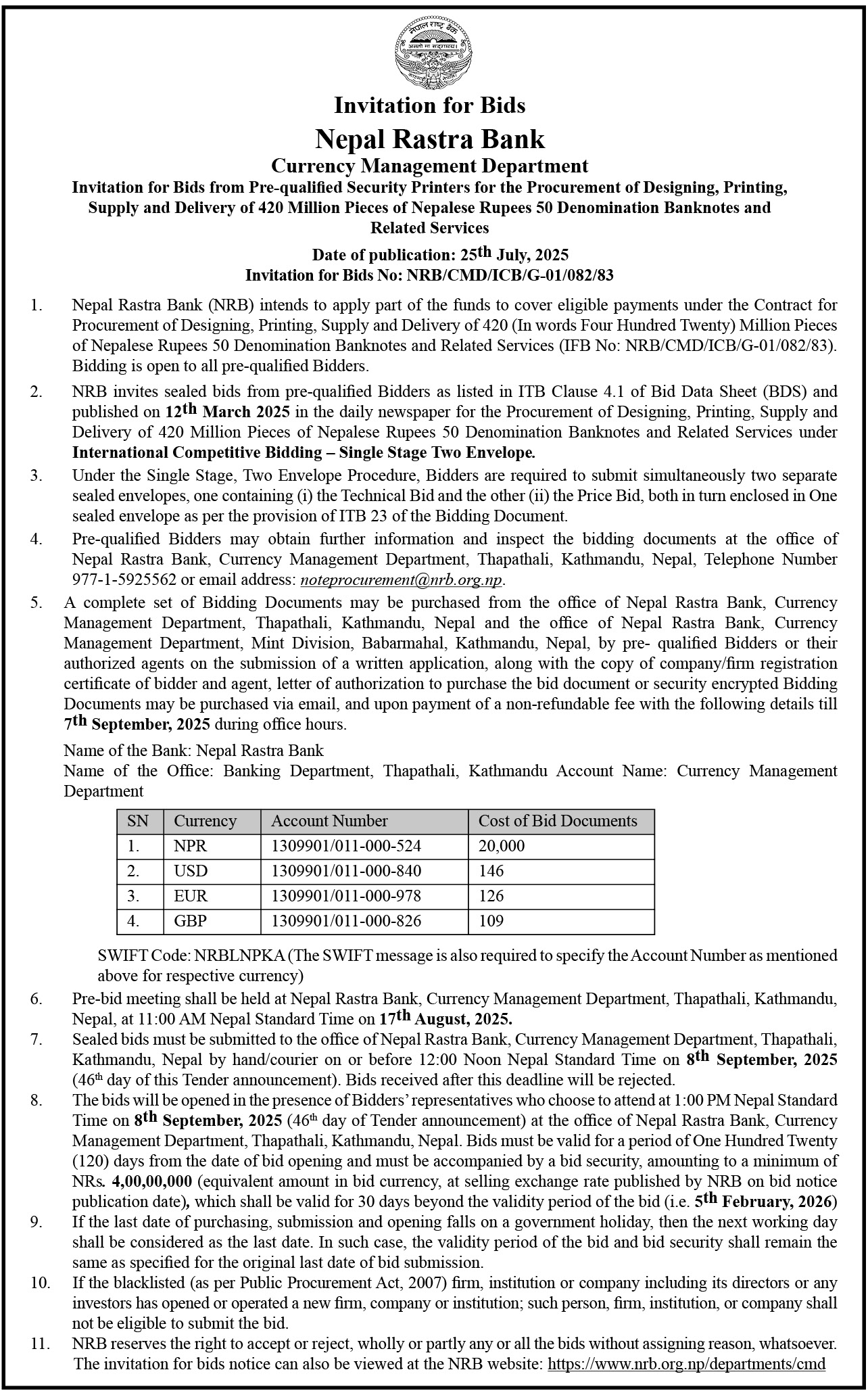 काठमाडौं । नेपाल राष्ट्र बैंकले नेपाली रुपैयाँको ५० दरका ४२ करोड प्रति नोट छपाइ तथा आपूर्तिका लागि बोलपत्र आह्वान गरेको छ ।