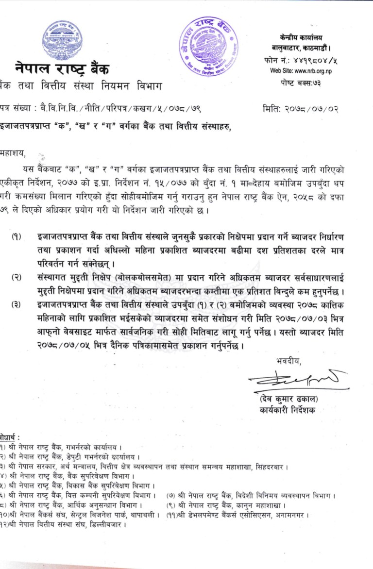 साथै, बैंक तथा वित्तीय संस्थाले कात्तिक महिनाका लागि प्रकाशित भइसकेको ब्याजदर समेत बढी भएको अवस्थामा संशोधन गर्नुपर्नेछ । यसरी कात्तिक ३ गतेभित्र आफ्नो वेवसाइटमा सार्वजनिक गर्ने गरी सोही मितिबाट लागू गर्नुपर्नेछ । यस्तो ब्याजदर कात्तिक ५ गतेभित्र दैनिक पत्रिकामा समेत प्रकाश गर्नुपर्नेछ ।