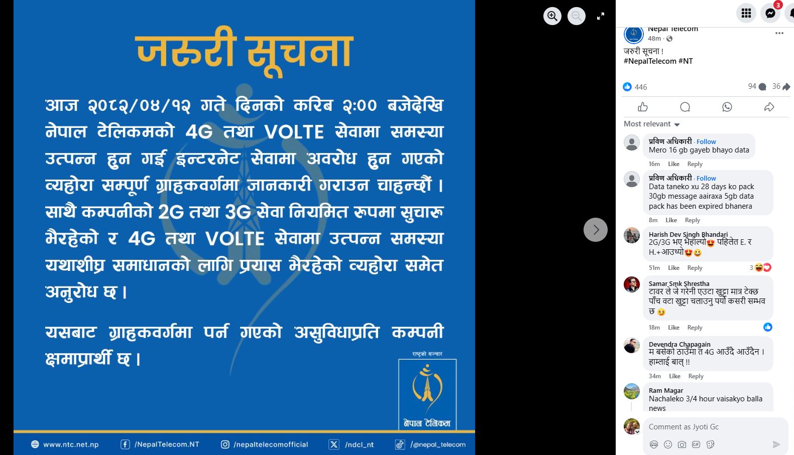 कम्पनीले आफ्नो फेसबुक पेजमार्फत यसबारे जानकारी दिएको हो । उक्त जानकारीमाथि प्रतिक्रिया दिने कतिपय ग्राहकहरूले इन्टरनेट सेवामा समस्या आएलगत्तै आफ्नो डाटा प्याकहरू गायव भएको र अर्को प्याक लिन अनुरोध आइरहेको उल्लेख गरेका छन् ।
