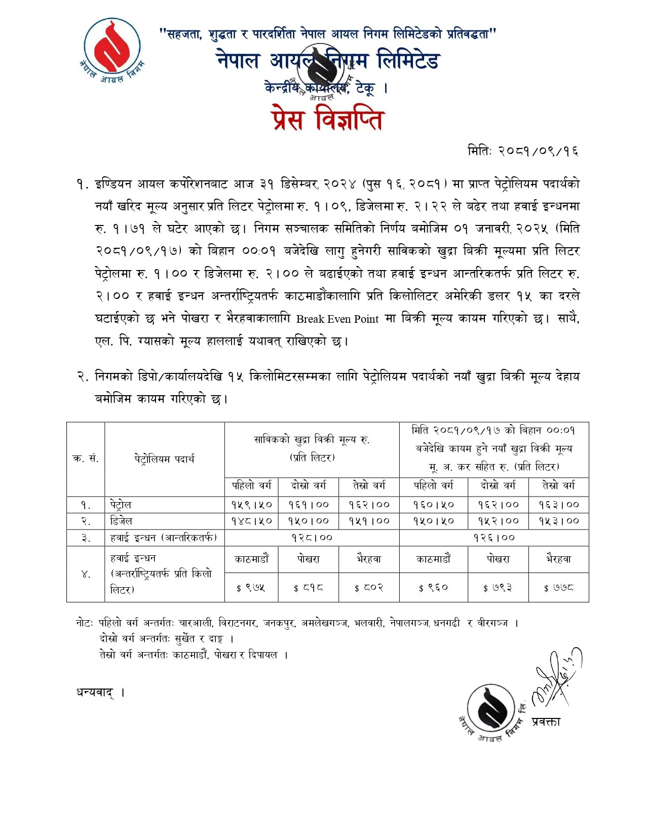 नयाँ मूल्य आज राति १२ बजेपछि लागू हुनेछ ।