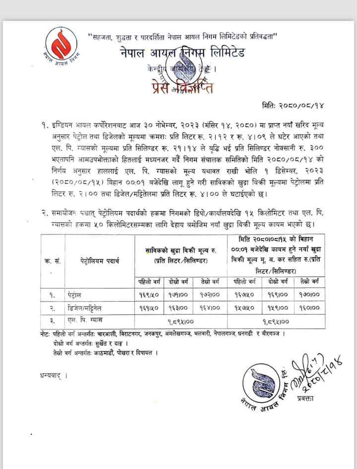 अब पेट्रोलको मुल्य काठमाडौमा प्रतिलिटर १७० रुपैयाँ र डिजेलको १६० रुपैयाँ पर्ने छ । निगमले ग्यासको मूल्य भने घटाएको छन् ।