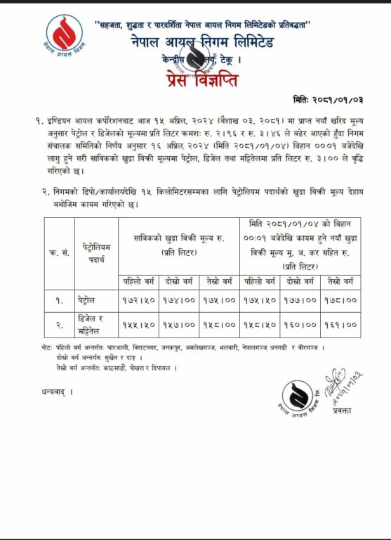 निगमले आज राति १ बजेदेखि लागु हुनेगरी नयाँ मूल्य तोकेको हो ।