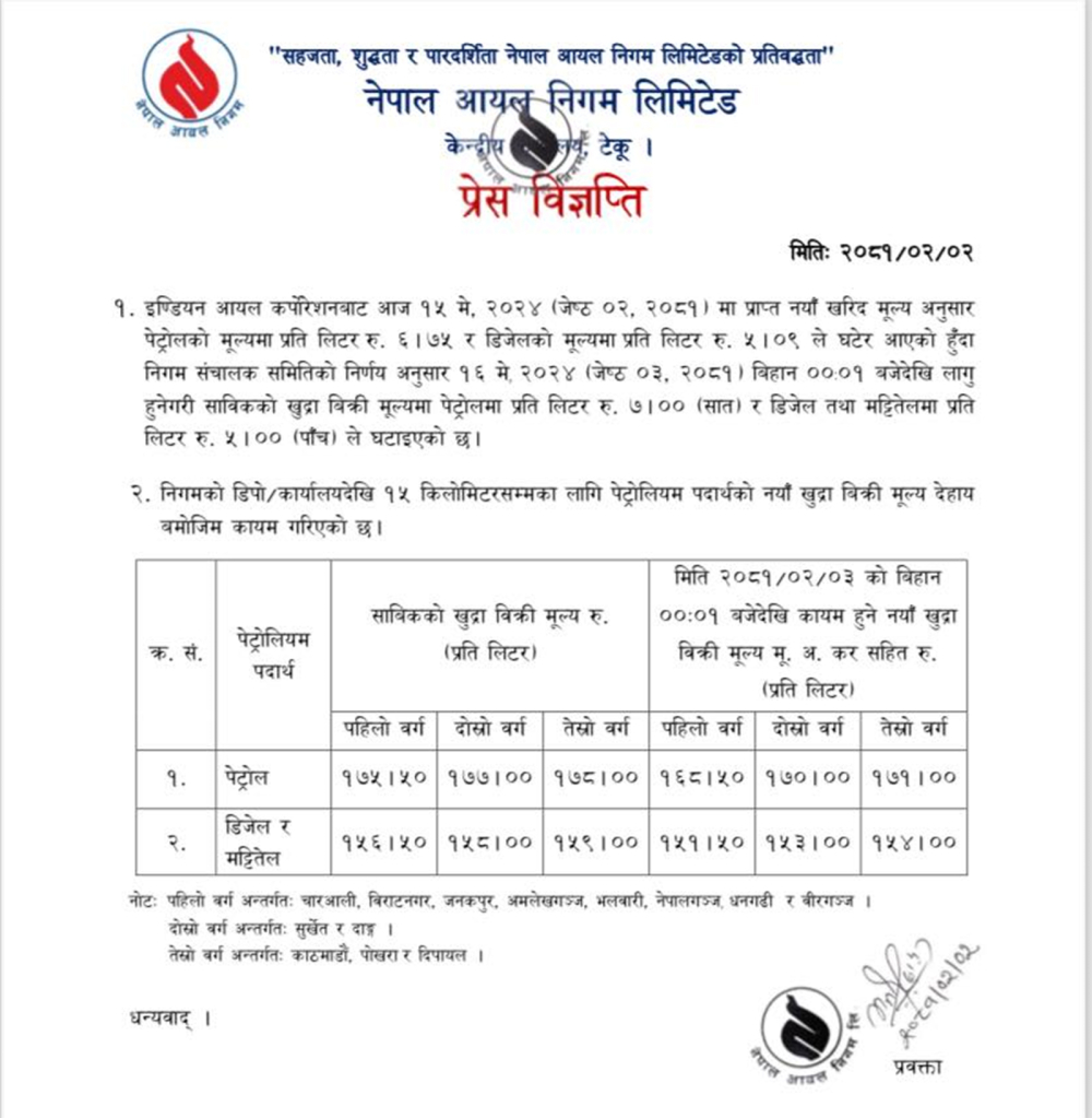 नयाँ मूल्य आज रातिदेखि लागू हुनेछ ।
