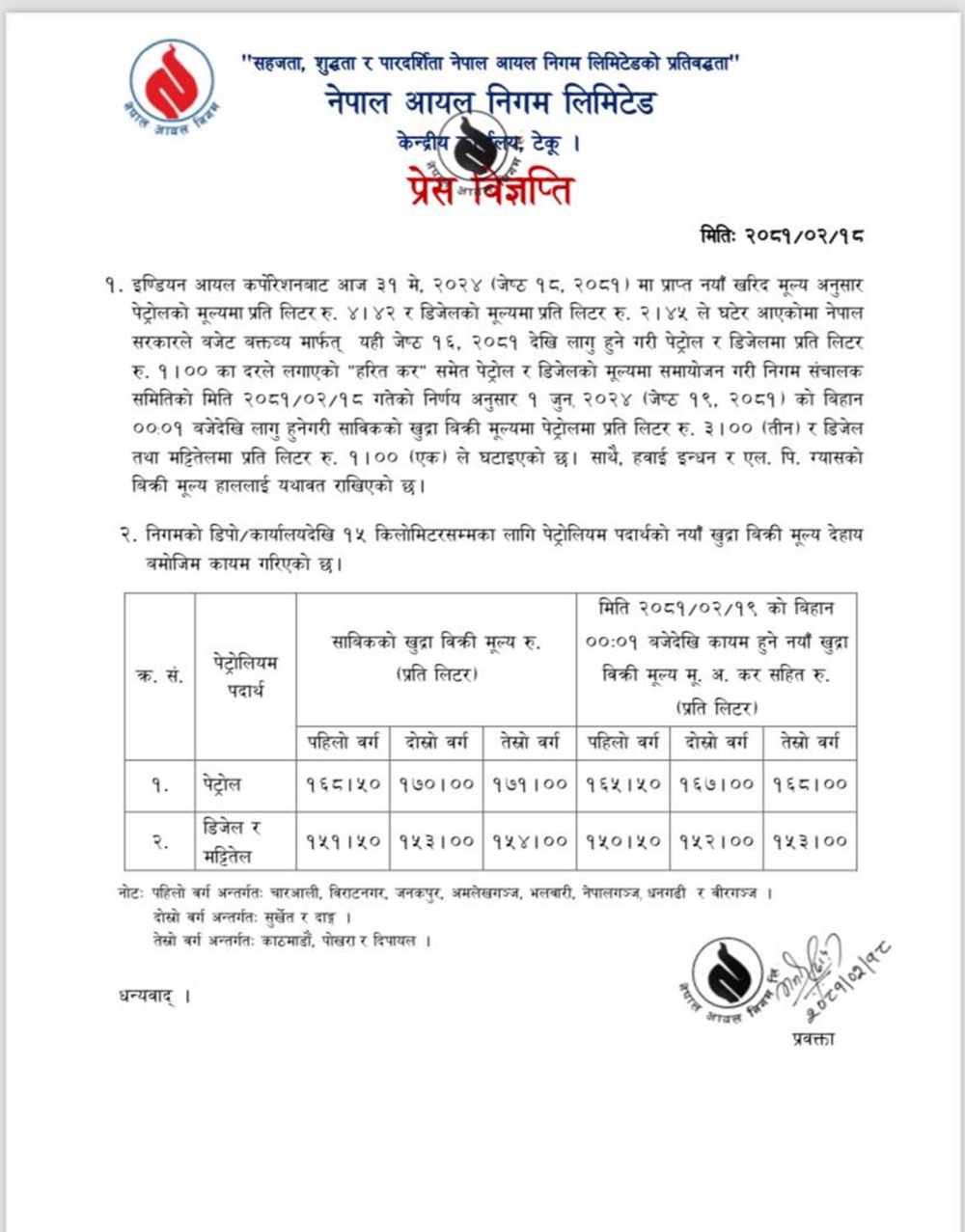 नेपाल आयल निगमले पेट्रोलमा प्रतिलिटर ३ रुपैयाँ र डिजेल तथा मट्टीतेलको प्रतिलिटर १ रुपैयाँ घटाएको छ ।
