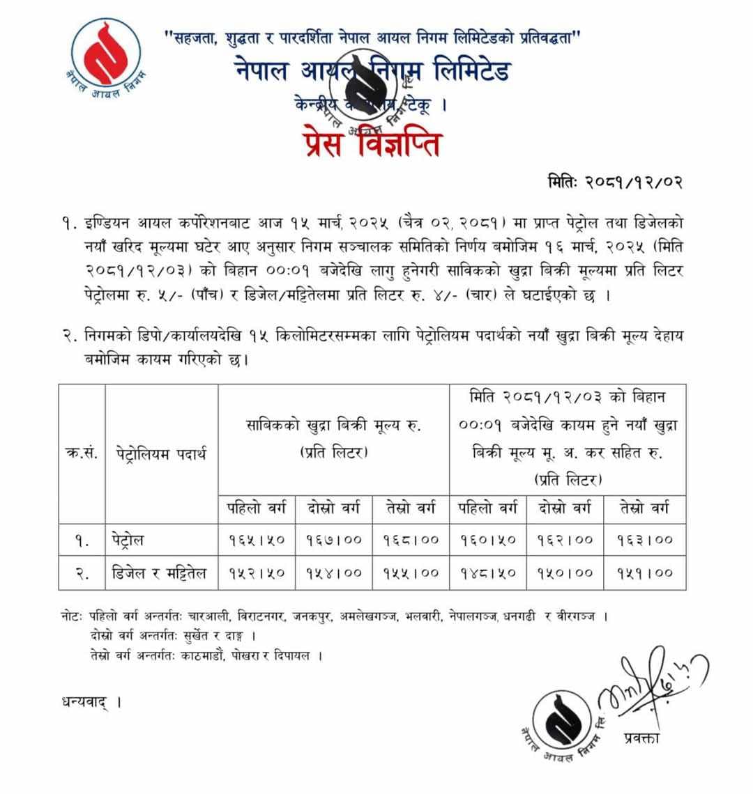 निगमले आज राति १२ बजेपछि लागू हुनेगरी पेट्रोल, मट्टीतेल र डिजेलको मूल्य घटाएको हो ।