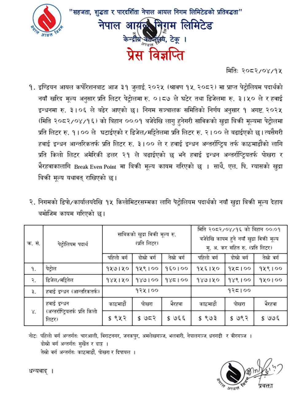 निगमले विहिबार राति १२ बजेपछिबाट लागू हुनेगरी पेट्रोलियम पदार्थको मुल्य परिवर्तन गरेको हो ।
