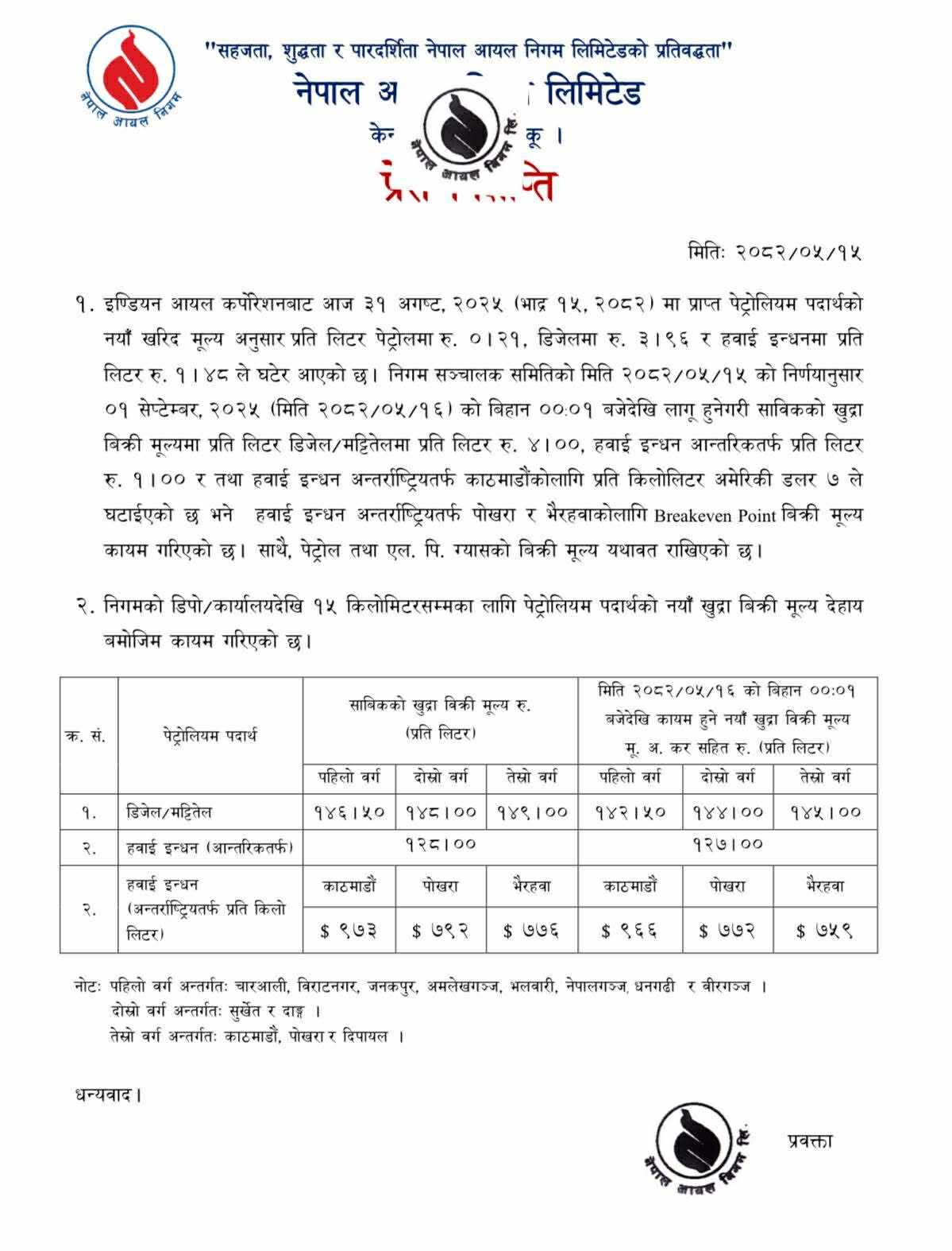त्यस्तै निगमले हवाई इन्धन आन्तरिकतर्फ प्रति लिटर १ तथा अन्तर्राष्ट्रियतर्फ काठमाडौँका लागि प्रति किलोलिटर ७ डलरले घटाएको छ । पोखरा र भैरहवाका लागि ब्रेक इभन प्वाइन्ट बिक्रि मुल्य कायम गरेको निगमले जनाएको छ ।