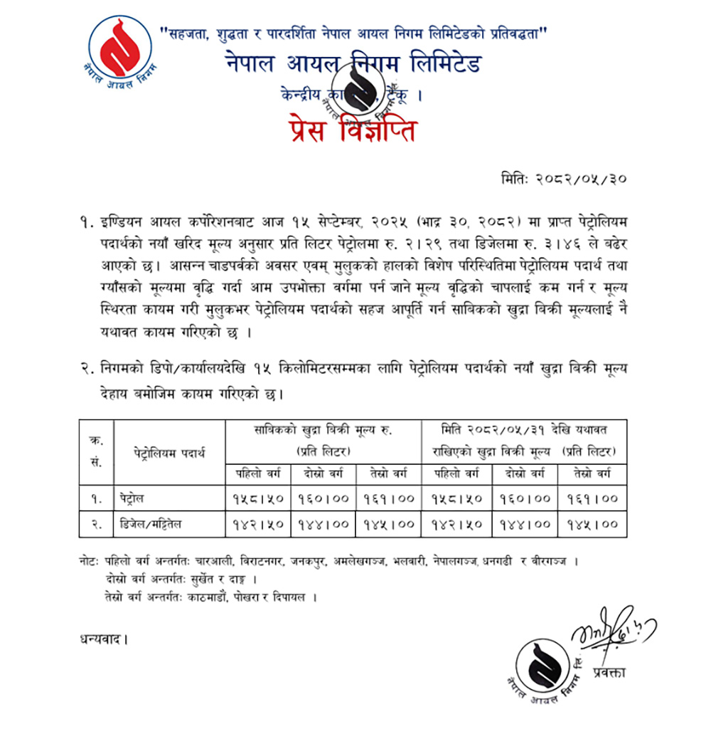 हाल काठमाडौँमा पेट्रोल प्रतिलिटर १६१ रुपैयाँ र डिजल तथा मट्टीतेलको प्रति लिटर १४५ रहेको छ ।