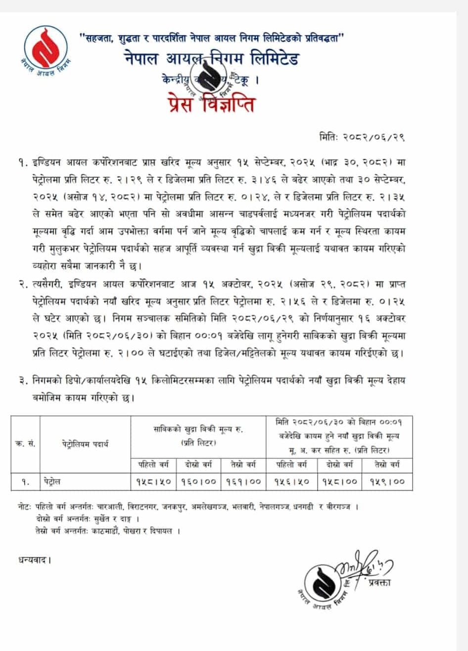 निगमका अनुसार काठमाडौँ उपत्यका, पोखरा र दीपायलमा पेट्रोल प्रतिलिटर १५९ रुपैयाँ, सुर्खेत र दाङमा १५८ रुपैयाँ तथा बाँकी क्षेत्रमा १५६.५० रुपैयाँ कायम भएको छ ।