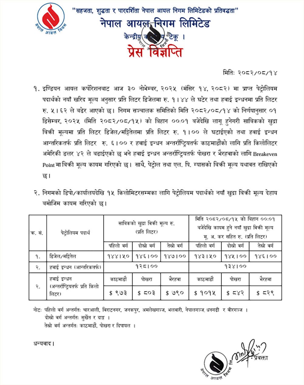 निगमले आइतबार राति १२ बजेदेखि लागु हुने गरि डिजल तथा पेट्रोलमा प्रतिलिटर १ रुपैयाँ ले घटाएको हो । हवाई इन्धनको मुल्य आन्तरिक तर्फ प्रति लिटर ६ र अन्तर्राष्ट्रिय तर्फ काठमाडौँका लागि प्रति किलो लिटर ४२ डलरले बढाएको छ ।