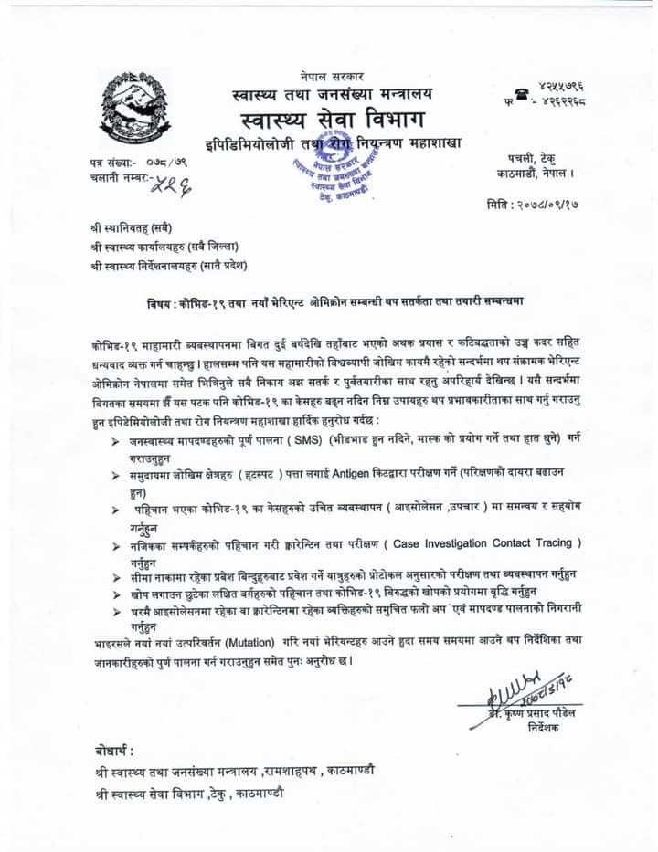 काठमाडौं । स्वास्थ्य तथा जनसंख्या मन्त्रालयले कोभिड–१९ तथा नयाँ भेरिएन्ट ओमिक्रोन फैलन नदिन देशभरका स्थानीय तह, प्रदेश सरकार र स्वास्थ्य कार्यालयहरूलाई थप सर्तकता अपनाउन आग्रह गरेको छ ।