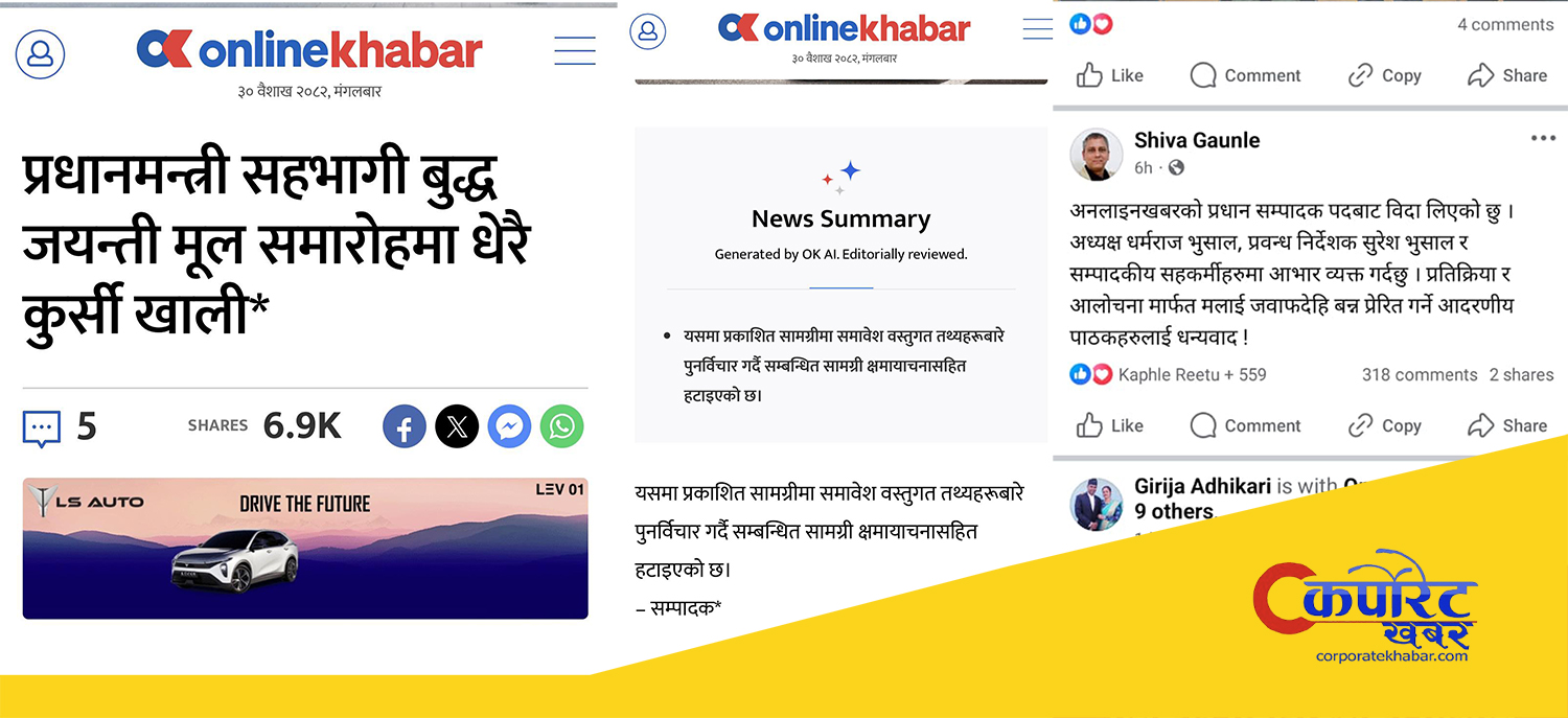 ‘अनलाइन खबरको प्रधान सम्पादक पदबाट विदा लिएको छु । अध्यक्ष धर्मराज भुसाल, प्रबन्ध निर्देशक सुरेश भुसाल र सम्पादकीय सहकर्मीहरूमा आभार व्यक्त गर्दछु,’ उनले फेसबुकमा लेखेका छन्, ‘प्रतिक्रिया र आलोचना मार्फत मलाई जवाफदेही बन्न प्रेरित गर्ने आदरणीय पाठकहरूलाई धन्यवाद !’