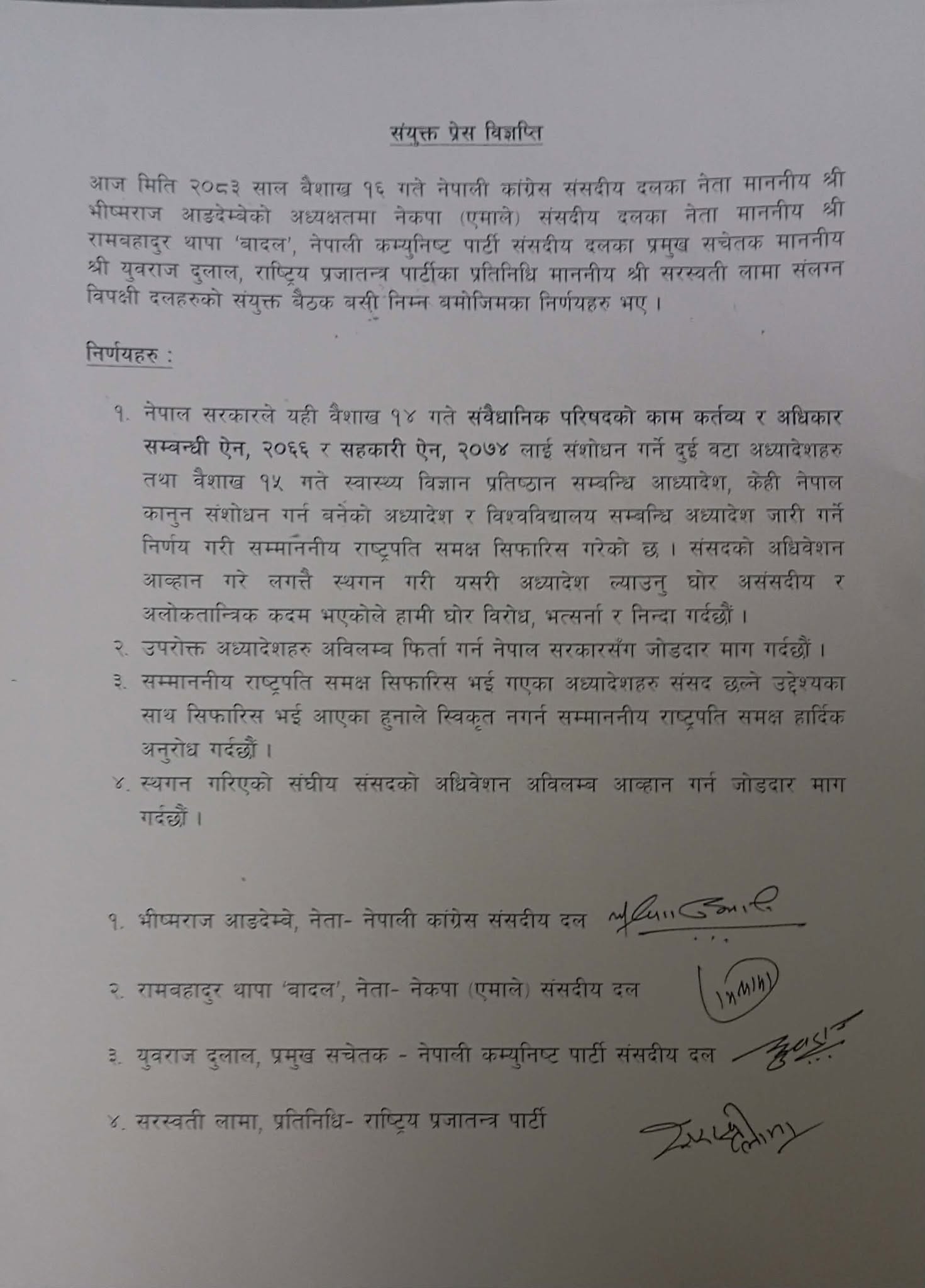 प्रतिपक्षी दलहरूले स्थगन गरिएको संघीय संसदको दुवै सदनको अधिवेशन अविलम्ब आह्वान गर्न पनि आग्रह गरेका छन्।