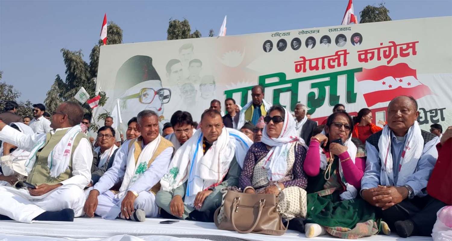 जनकपुरधाम । नेपाली कांग्रेसको ’प्रतिज्ञासभा’ सुरु भएको छ । जनकपुरधामको तिरहिुतिया गाछीमा प्रतिज्ञासभा सुरु भएको हो । कांग्रेले मधेशमा प्रतिज्ञासभा गरेर देशव्...