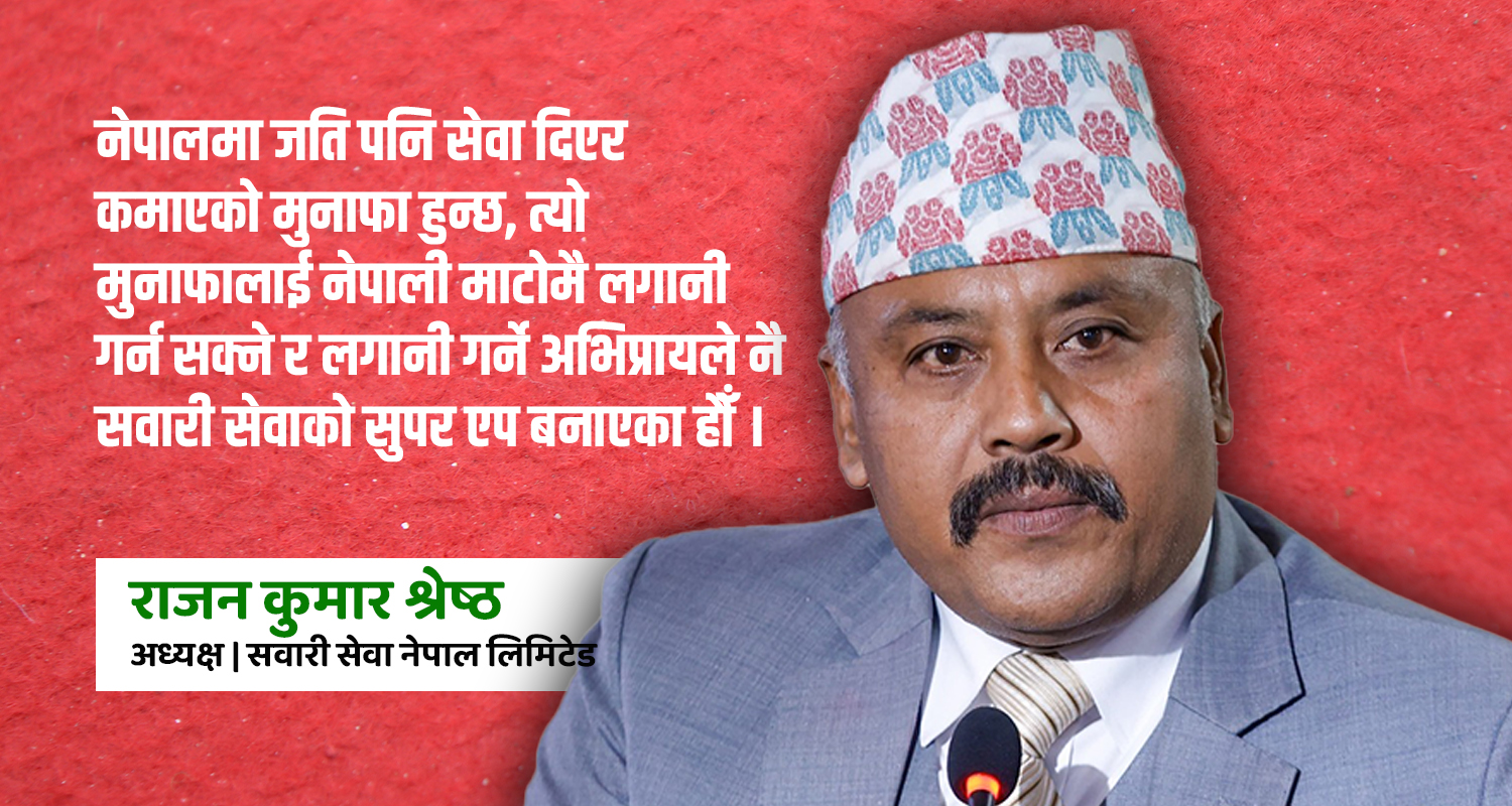 राजन कुमार श्रेष्ठ अध्यक्ष | सवारी सेवा नेपाल लिमिटेड काठमाडौं । सवारी सेवा नेपाल लिमिटेडले अब छिट्टै नै राइड शेयरिङ एप प्रयोगकर्ताका लागि नेपालमै नोपालीले बन...