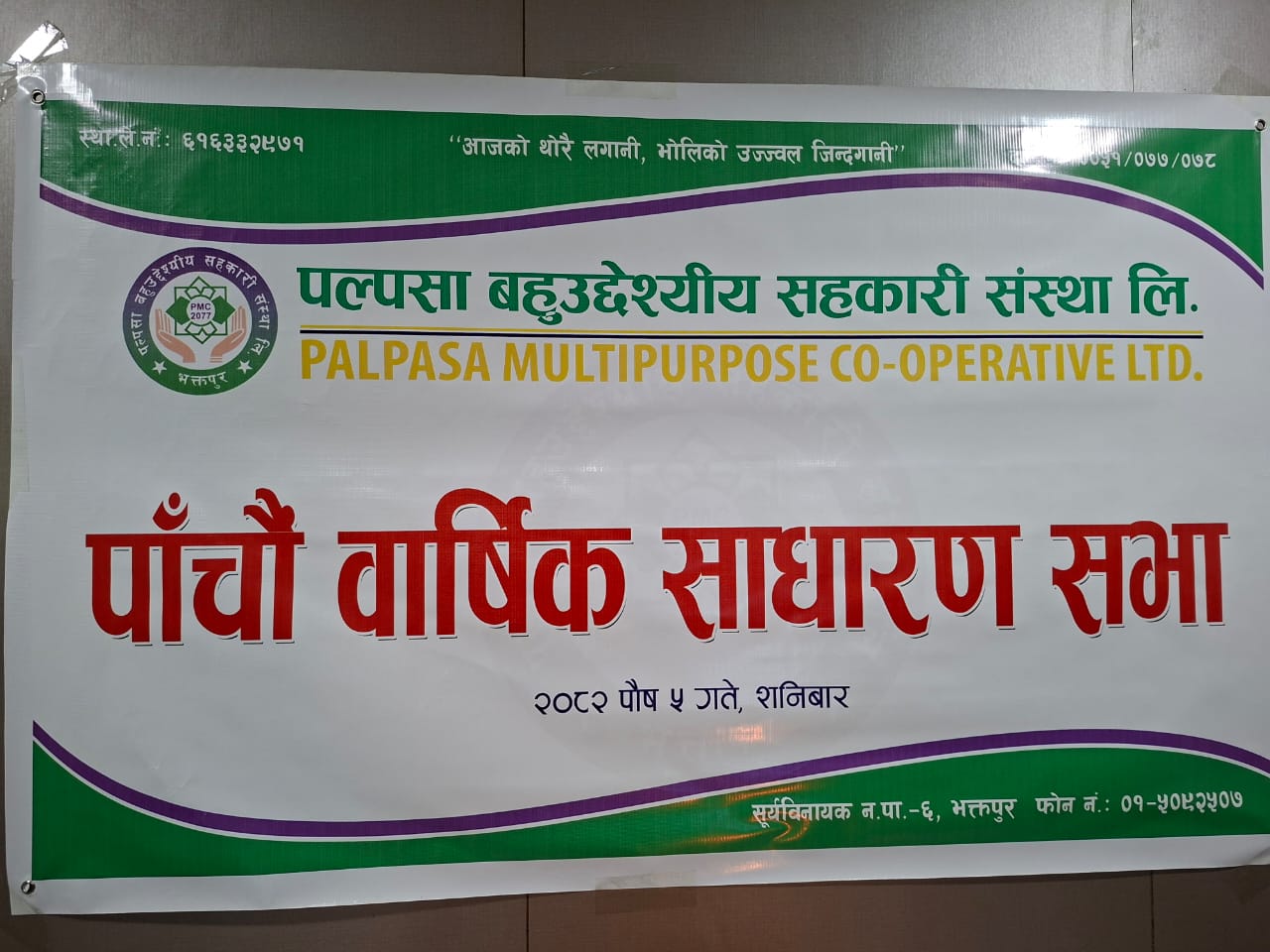 काठमाडौं । पल्पसा बहुउद्देशीय सहकारी संस्थाको पाँचौँ बार्षिक साधारण सभा सम्पन्न भएको छ । शनिबार भक्तपुरको सूर्यविनायक नगरपालिका वडा – ६मा संस्थाको पाचौँ बार्षिक साधारण सभा सम्पन्न भएको हो ।