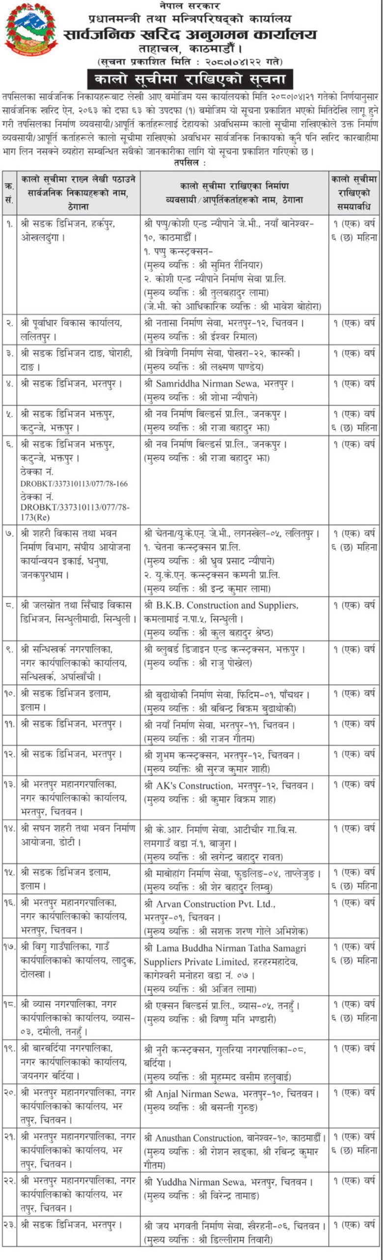 सडक डिभिजन हर्कपुर ओखलढुंगाको सिफारिसमा पप्पुरकोशी एण्ड न्यौपानेलाई डेढ वर्षका लागि कालोसूचीमा राखिएको छ । पूर्वाधार विकास कार्यालयको सिफारिसमा नतासा निर्माण सेवा भरतपुरलाई एक वर्ष कालोसूचीमा राखिएको छ । धेरैजसो सडक डिभिजन भरतपुरबाट आएको सिफारिसका आधारमा ठेकेदार व्यवसायी कालोसूचीमा परेको कार्यालयको सूचीमा उल्लेख छ ।