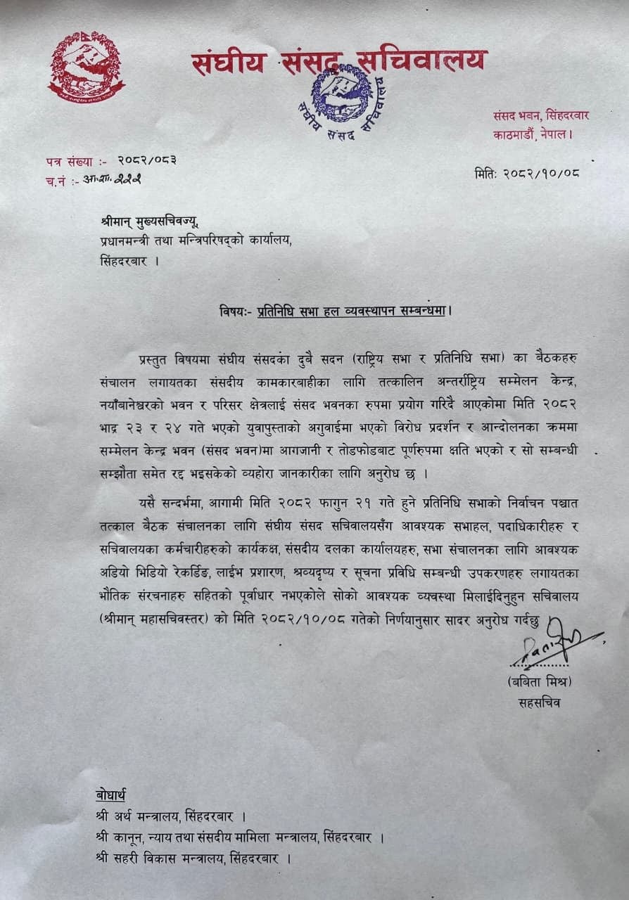 काठमाडौं । संघीय संसद सचिवालयले २१ फागुनको प्रतिनिधिसभा चुनावपछि आउने नयाँ संसदको लागि सभाहल माग गर्दै प्रधानमन्त्री कार्यालयलाई पत्र लेखेको छ । जेन्जी आन्दोलनका क्रममा गत २४ भदौमा संसद भवनमा आगजनी भएको थियो ।
