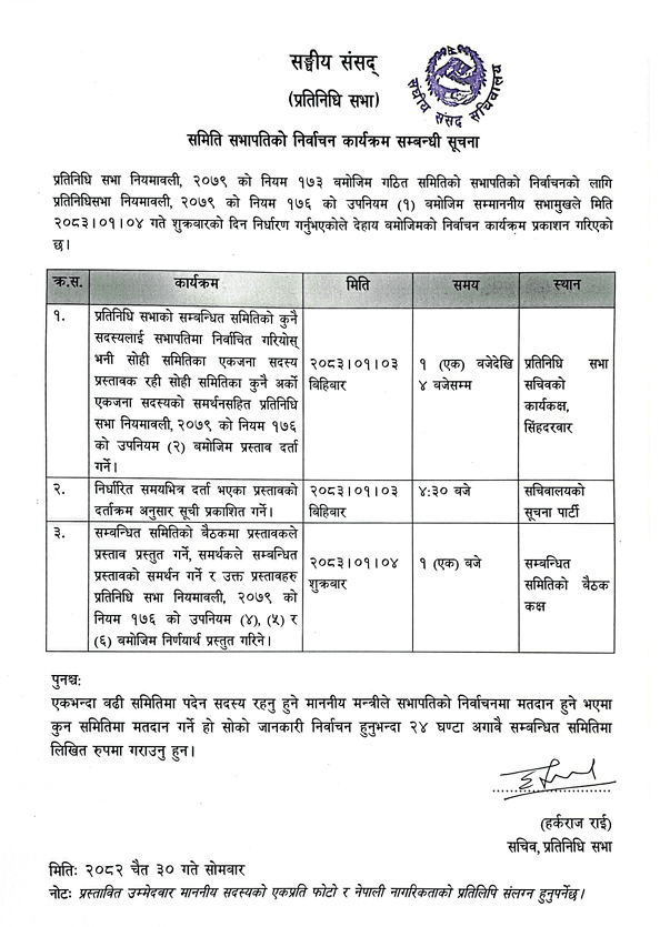 समिति सभापतिहरूको मनोनयन दर्ता सिंहदरबारस्थित प्रतिनिधिसभा सचिवको कार्यकक्षमा हुने सूचनामा उल्लेख छ ।