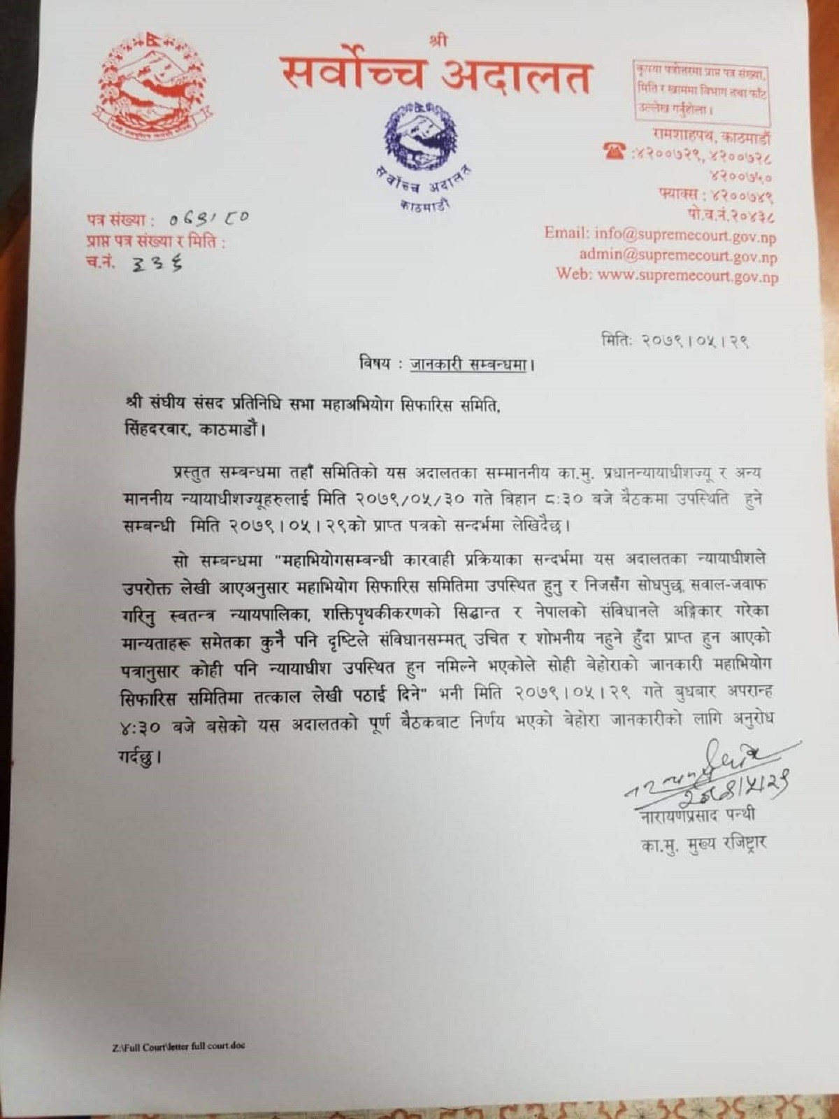 महाभियोगसम्बन्धी कारबाही प्रक्रियाका सन्दर्भमा यस अदालतका न्यायाधीशले उपरोक्त लेखी आएअनुसार महाभियोग सिफारिस समितिमा उपस्थित हुनु र निजसँग सोधपुछ, सवाल – जवाफ गरिनु स्वतन्त्र न्यायपालिका, शक्तिपृथकीकरणको सिद्धान्त र नेपालको संविधानले अङ्गिकार गरेका मान्यताहरू समेतका कुनै पनि दृष्टिले संविधानसम्मत् उचित र शोभनीय नहुने हुँदा प्राप्त हुन आएको पत्रानुसार कोही पनि न्यायाधीश उपस्थित हुन नमिल्ने भएकोले सोही व्यहोराको जानकारी महाभियोग सिफारिस समितिमा तत्काल लेखी पठाइदिने निर्णय बैठकले गरेको हो ।