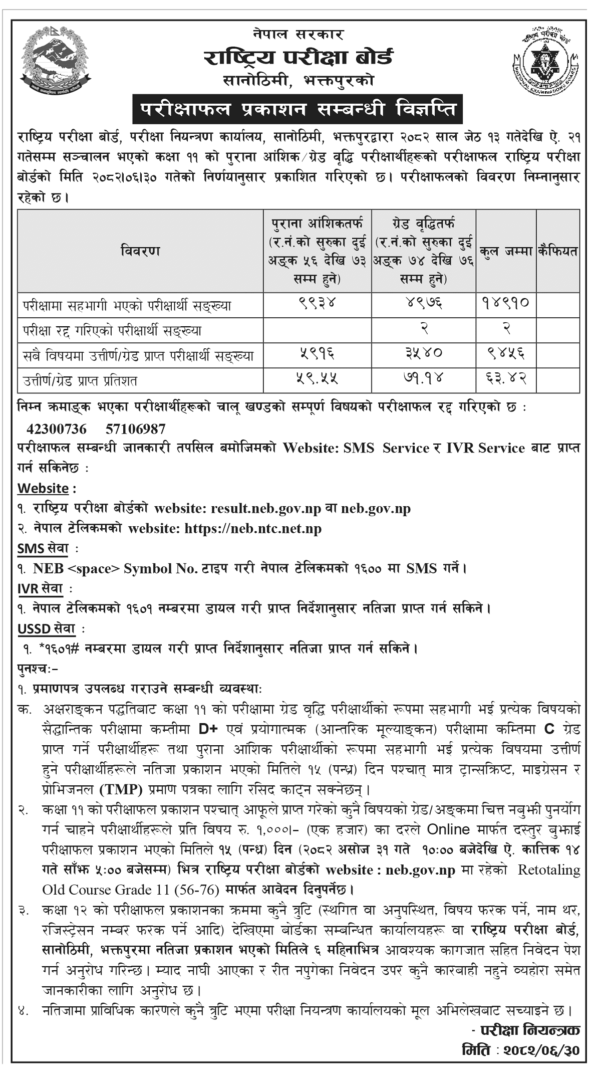 नतिजा राष्ट्रिय परीक्षा बोर्डको वेबसाइट वा नेपाल टेलिकमको १६०१ नम्बरमा डायल गरी प्राप्त निर्देशन अनुसार नतिजा प्राप्त गर्न सकिने छ ।