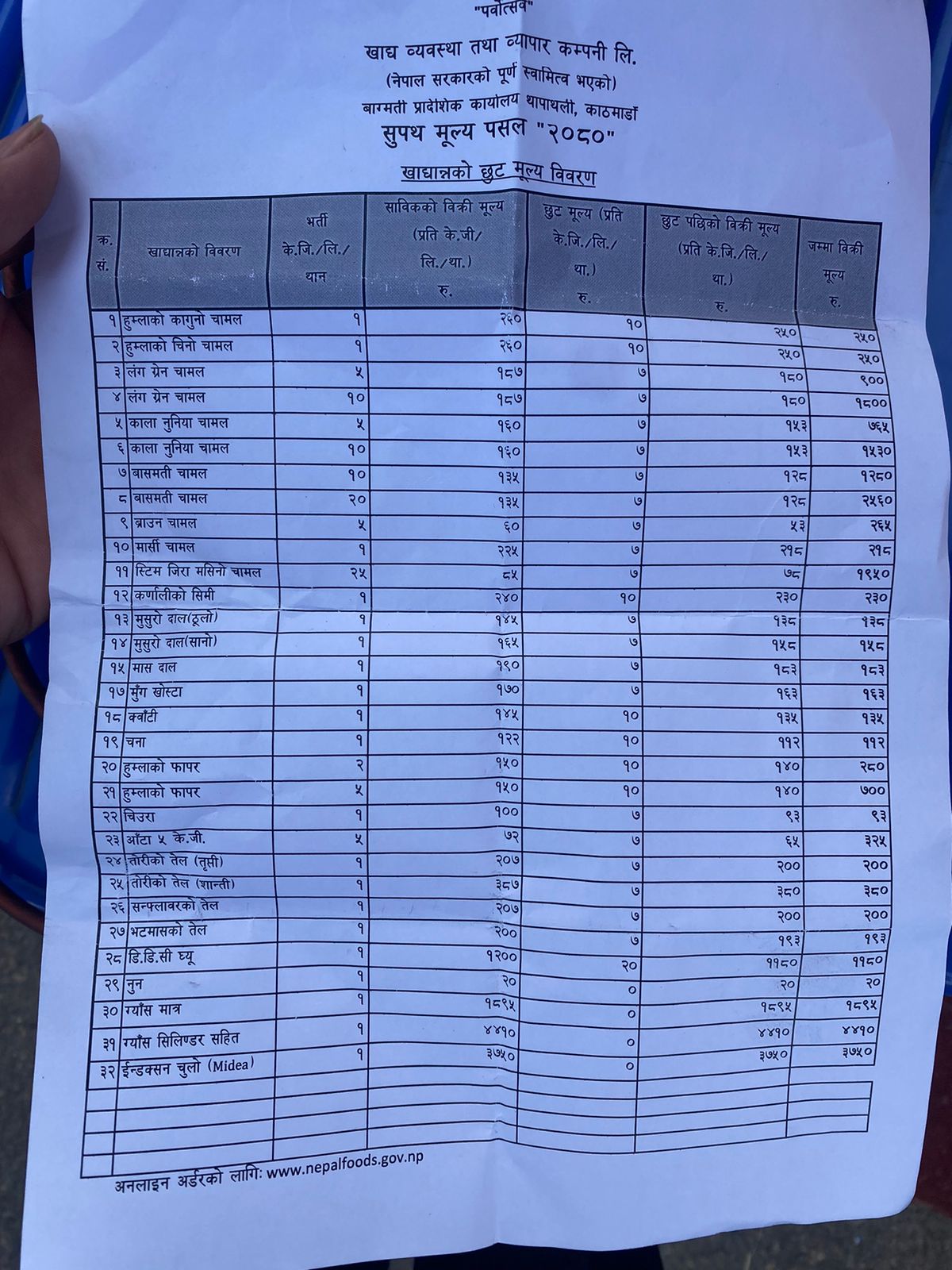 काठमाडौँ । दशैं, तिहार, छठलगायत चाडपर्वलाई लक्षित गर्दै सरकारले आइतबादेखि काठमाडौं उपत्यकासहित देशभर सुपथ मूल्य पसल सञ्चालनमा ल्याएको छ ।