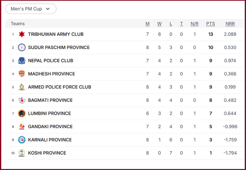 अंक तालिकाको कुरा गर्दा अहिलेसम्म त्रिभुवन आर्मी क्लब ७ खेल खेल्दै १३ अंकसहित शिर्ष स्थानमा छ । आर्मीले अब २ खेल खेल्न बाँकी रहेको छ । आर्मीले सोमबार कोशी प्रदेशसँग र बुधबार लुम्बिनी प्रदेशसँग खेल्ने छ ।