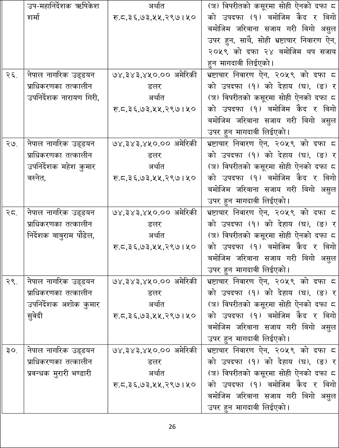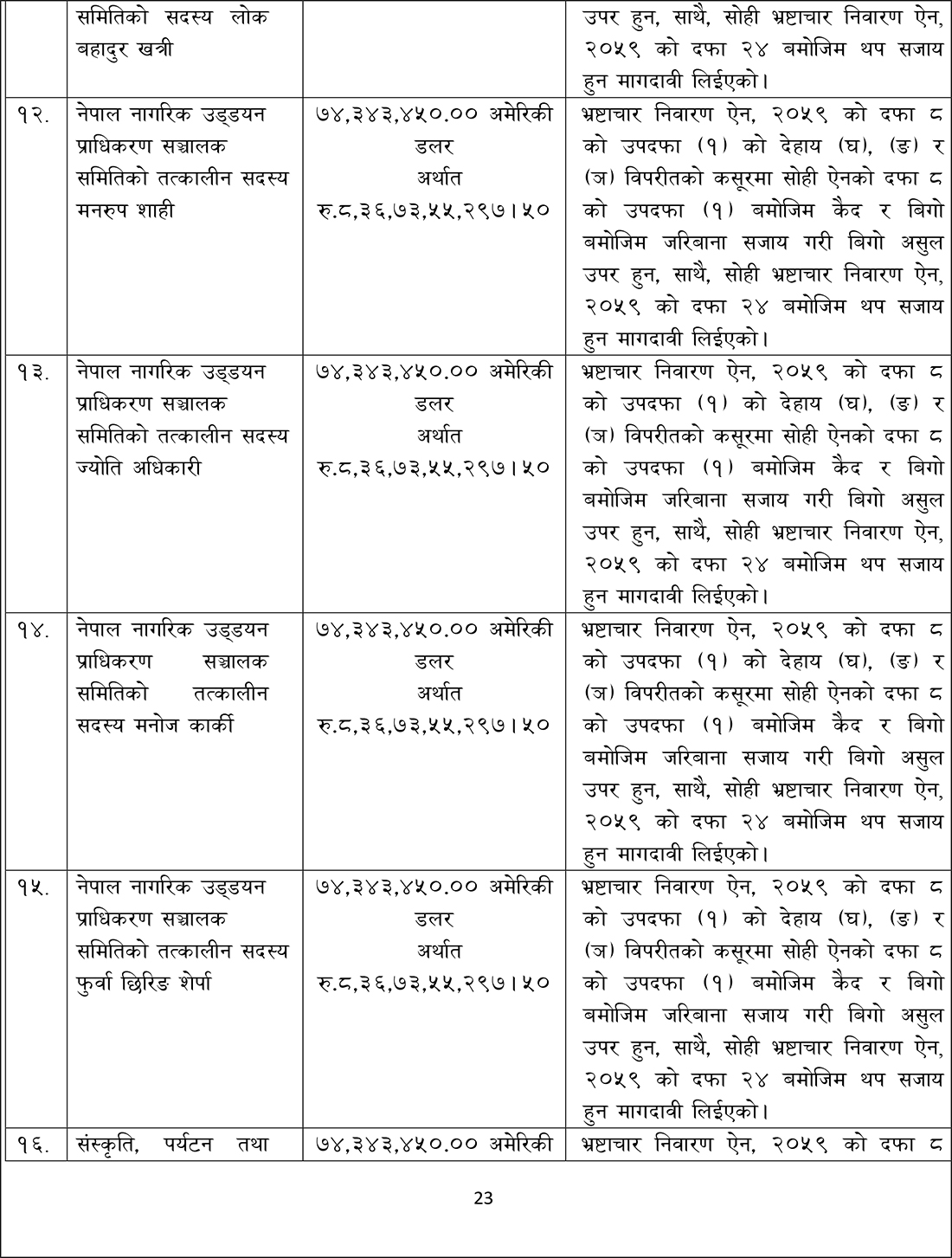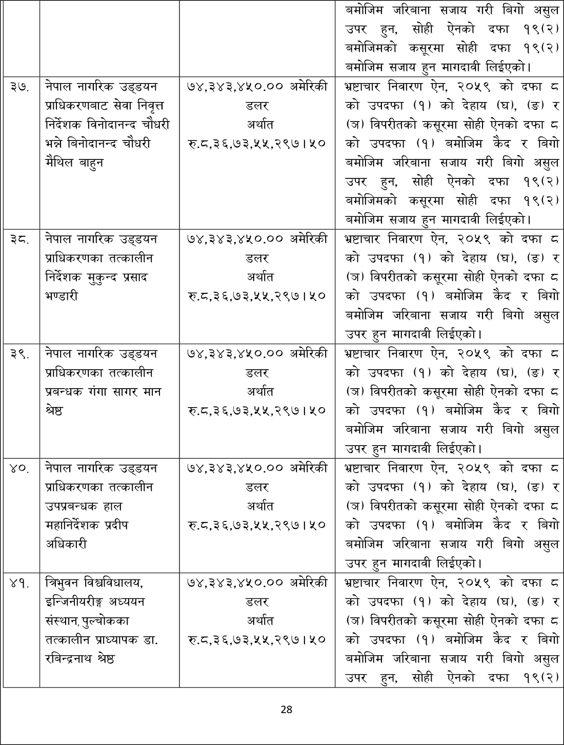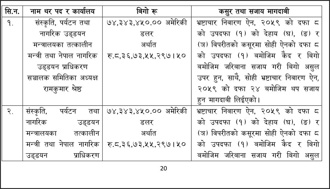 संस्कृति, पर्यटन तथा नागरिक उड्डयन मन्त्रालयका तत्कालीन मन्त्रीहरू स्व. पोष्टबहदुर बोगटी, रामकुमार श्रेष्ठ, भीम प्रसाद आचार्य, दीपक चन्द्र अमात्य, तत्कालीन अर्थमन्त्री डा. रामशरण महतविरुद्ध आज अख्तियारले मुद्दा दायर गरेको हो ।