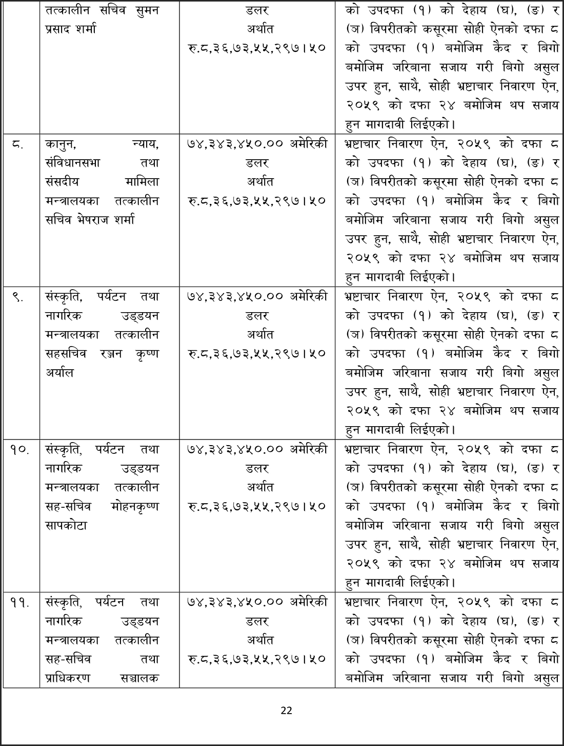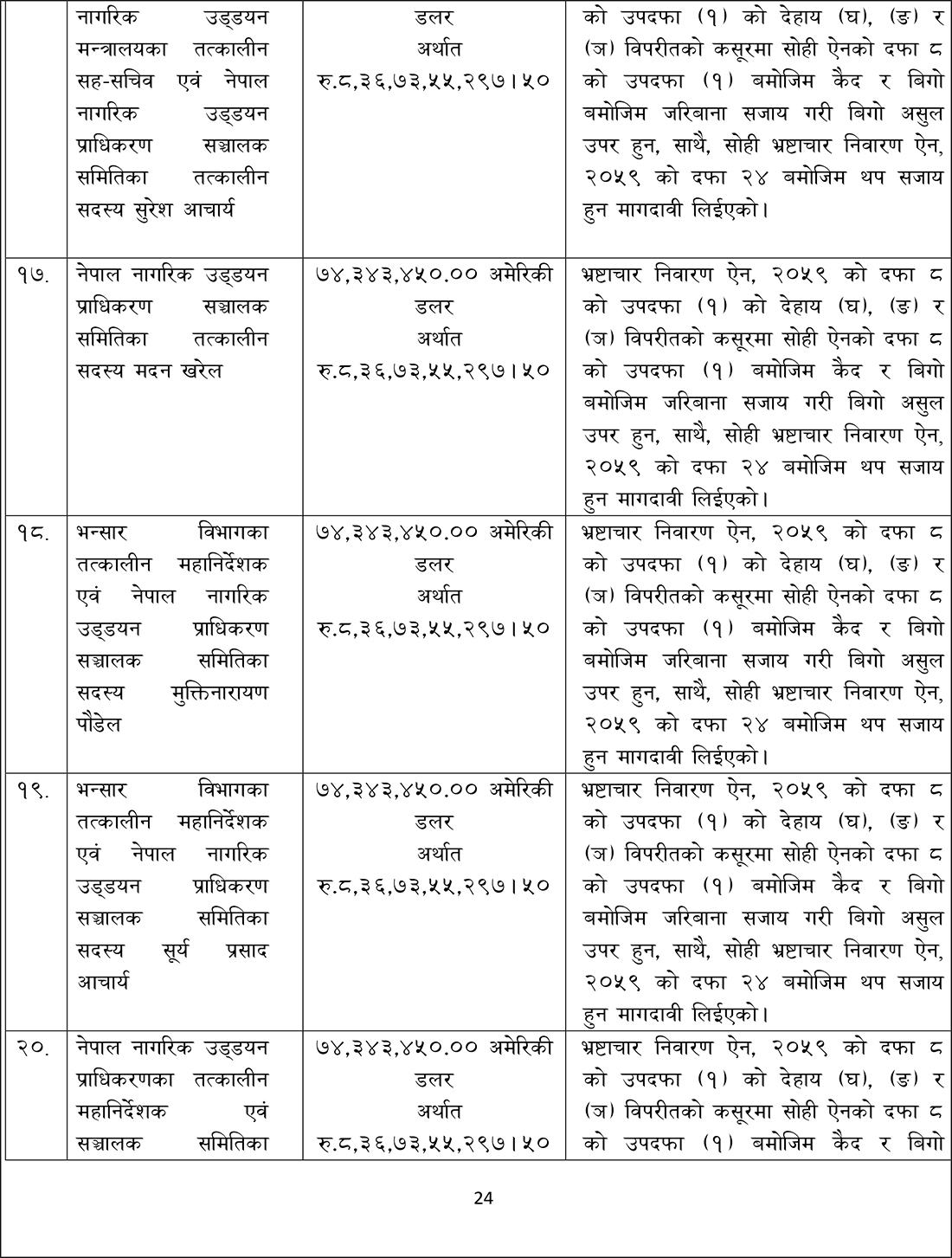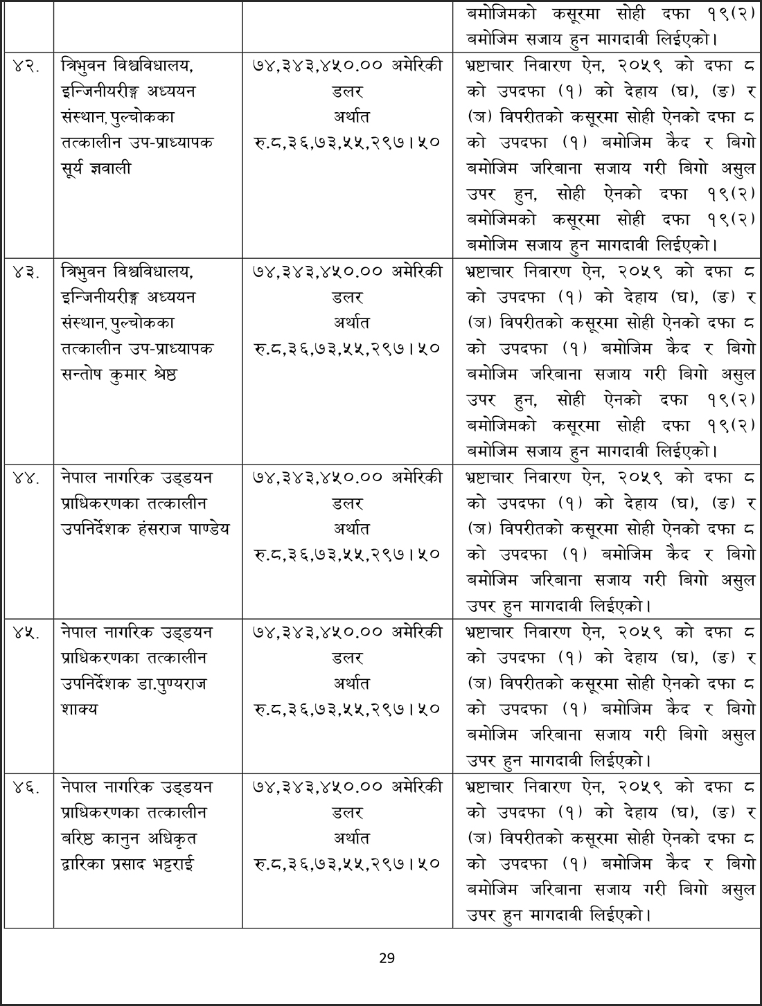 संस्कृति, पर्यटन तथा नागरिक उड्डयन मन्त्रालयका तत्कालीन मन्त्रीहरू स्व. पोष्टबहदुर बोगटी, रामकुमार श्रेष्ठ, भीम प्रसाद आचार्य, दीपक चन्द्र अमात्य, तत्कालीन अर्थमन्त्री डा. रामशरण महतविरुद्ध आज अख्तियारले मुद्दा दायर गरेको हो ।
