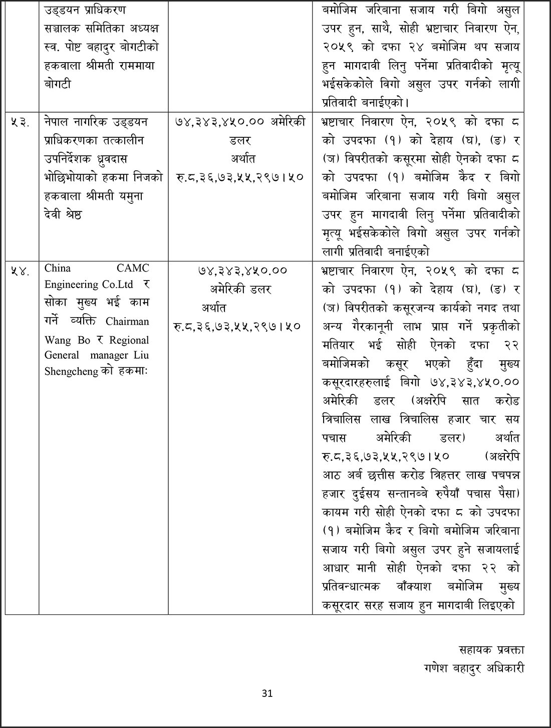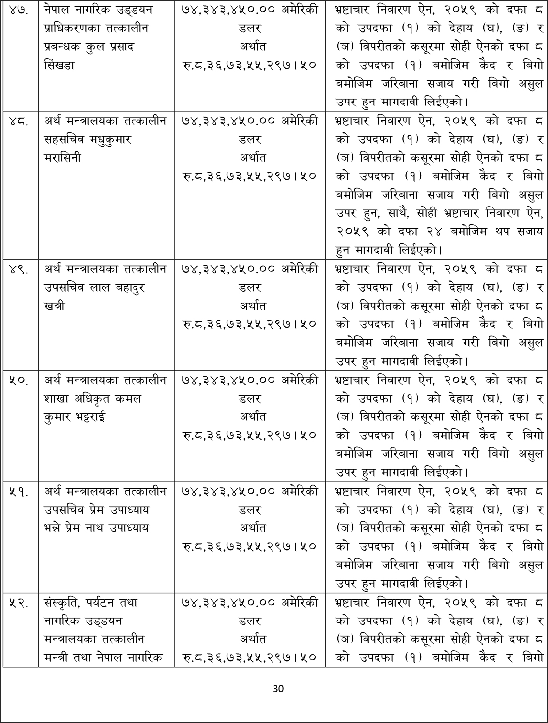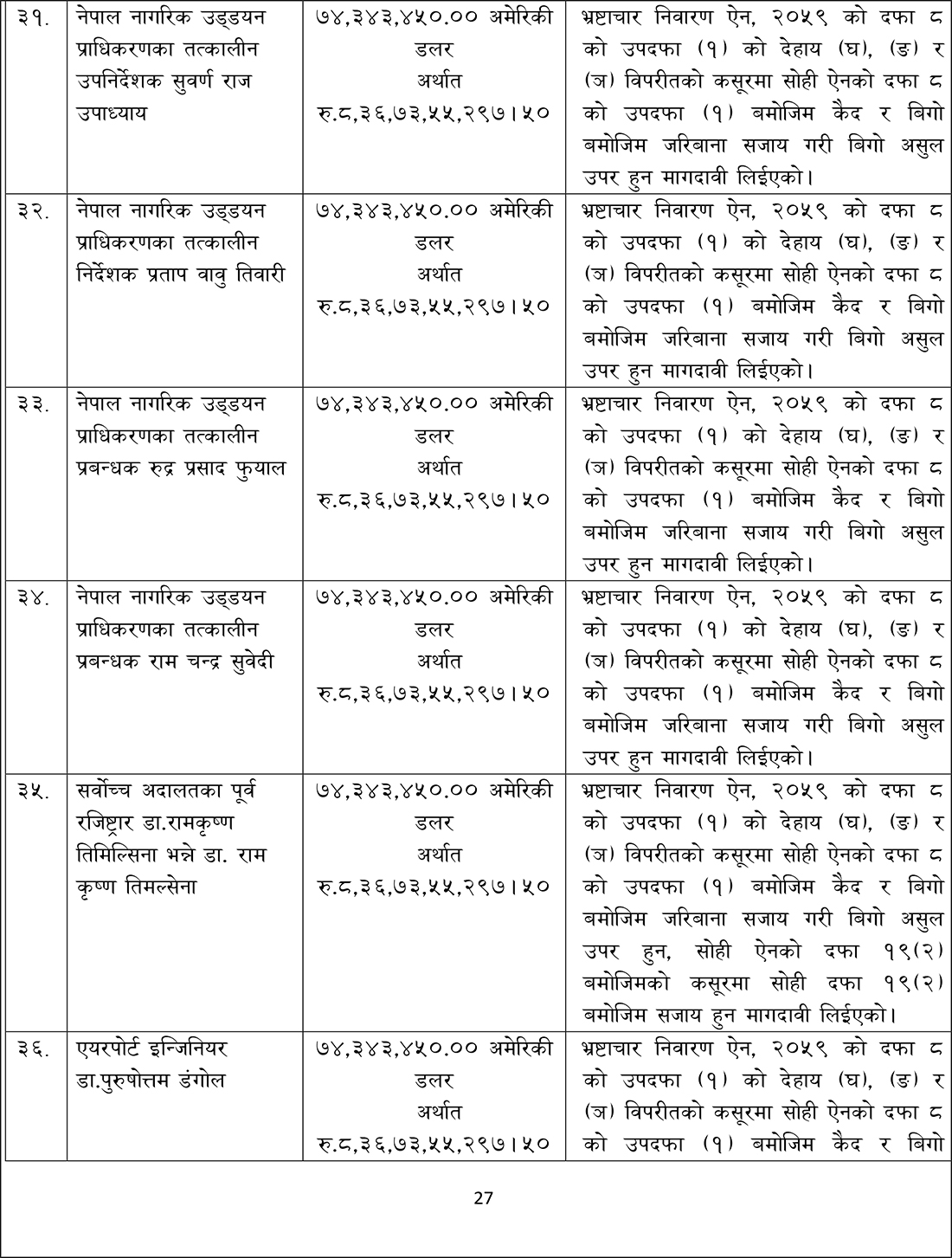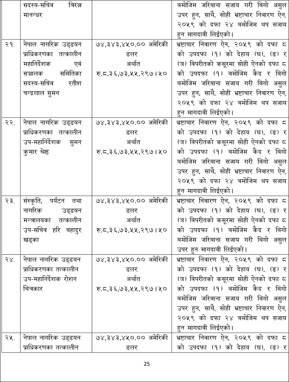 संस्कृति, पर्यटन तथा नागरिक उड्डयन मन्त्रालयका तत्कालीन मन्त्रीहरू स्व. पोष्टबहदुर बोगटी, रामकुमार श्रेष्ठ, भीम प्रसाद आचार्य, दीपक चन्द्र अमात्य, तत्कालीन अर्थमन्त्री डा. रामशरण महतविरुद्ध आज अख्तियारले मुद्दा दायर गरेको हो ।