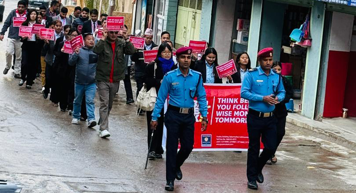 ‘अनुसरण गर्नुअघि सोचौं, भोलिका लागि बुद्धिमानीपूर्ण वित्तीय निर्णय गरौं, अरूका कुरा सुनौं तर आधिकारिक कुरा सुनी निर्णय गरौं’ भन्ने मूल नाराका साथ सोमबार र्याली आयोजना गरिएको हो । उक्त र्यालीले बुर्तिबाङ बजार क्षेत्रको परिक्रमा गरेको थियो ।र्यालीमा सहभागीहरूले वित्तीय साक्षरतासम्बन्धी नारा लेखिएका प्लेकार्ड र ब्यानर बोकेका थिए ।