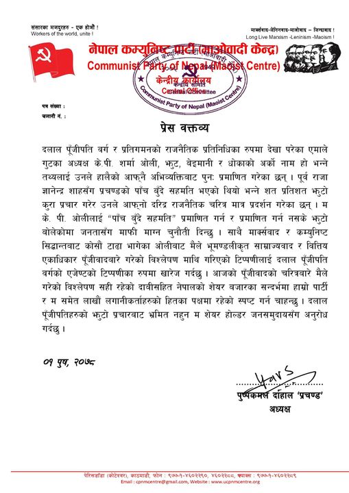 ओलीले पूर्वराजा ज्ञानेन्द्र शाहसँग प्रचण्डको पाँच बुँदे सहमति भएको भनेर बुधबार सार्वजनिक अभिव्यक्ति दिएका थिए । ‘म केपी ओलीलाई ‘पाँच बुँदे सहमति’ प्रमाणित गर्न र प्रमाणित गर्न नसके झुटो बोलेकोमा जनतासँग माफी माग्न चुनौती दिन्छु,’ प्रचण्डले बिहीबार वक्तव्यमार्फत भनेका छन् ।