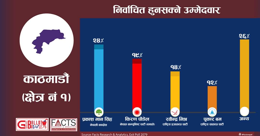 निर्वाचनबारे एक्टिज पोल सार्वजनिक गर्दै आएको फ्याक्ट्स नेपालले नेपाली कांग्रेसमा प्रकाश मान श्रेष्ठले २४ प्रतिशत मतसहित निर्वाचित हुने प्रक्षेपण गरेको हो । उक्त क्षेत्रमा मतदान गरेका मतदातासँगको कुराकानीका फ्याक्टसले यस्तो प्रक्षेपण गर्दै आएको छ ।