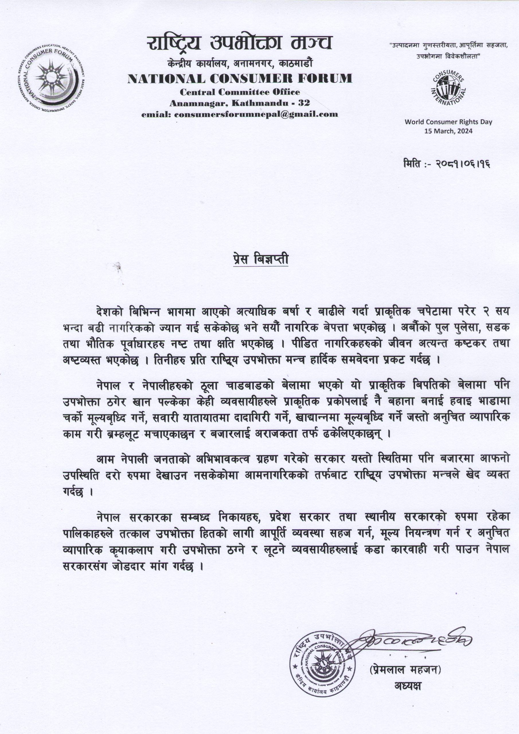 ‘नेपाल र नेपालीहरुको ठूला चाडबाडको बेलामा भएको यो प्राकृतिक विपत्तिको बेलामा पनि उपभोक्ता ठगेर खान पल्केका केही व्यवसायीहरुले प्राकृतिक प्रकोपलाई नै बहाना बनाई हवाइ भाडामा चर्को मूल्य वृद्धि गर्ने, सवारी यातायातमा दादागिरी गर्ने, खाद्यान्नमा मूल्य वृद्धि गर्ने जस्तो अनुचित व्यापारिक काम गरी ब्रह्मलूट मच्चाएका छन् र बजारलाई अराजकता तर्फ धकेलेका छन्,’ मञ्चका अध्यक्ष प्रेम लाल महर्जनद्वारा हस्ताक्षरित विज्ञप्तिमा भनिएको छ, ‘आम नेपाली जनताको अभिभावकत्व ग्रहण गरेको सरकार यस्तो स्थितिमा पनि बजारमा आफनो उपस्थिति दरो रुपमा देखाउन नसकेकोमा आम नागरिकको तर्फबाट राष्ट्रिय उपभोक्ता मञ्चले खेद व्यक्त गर्दछ ।’