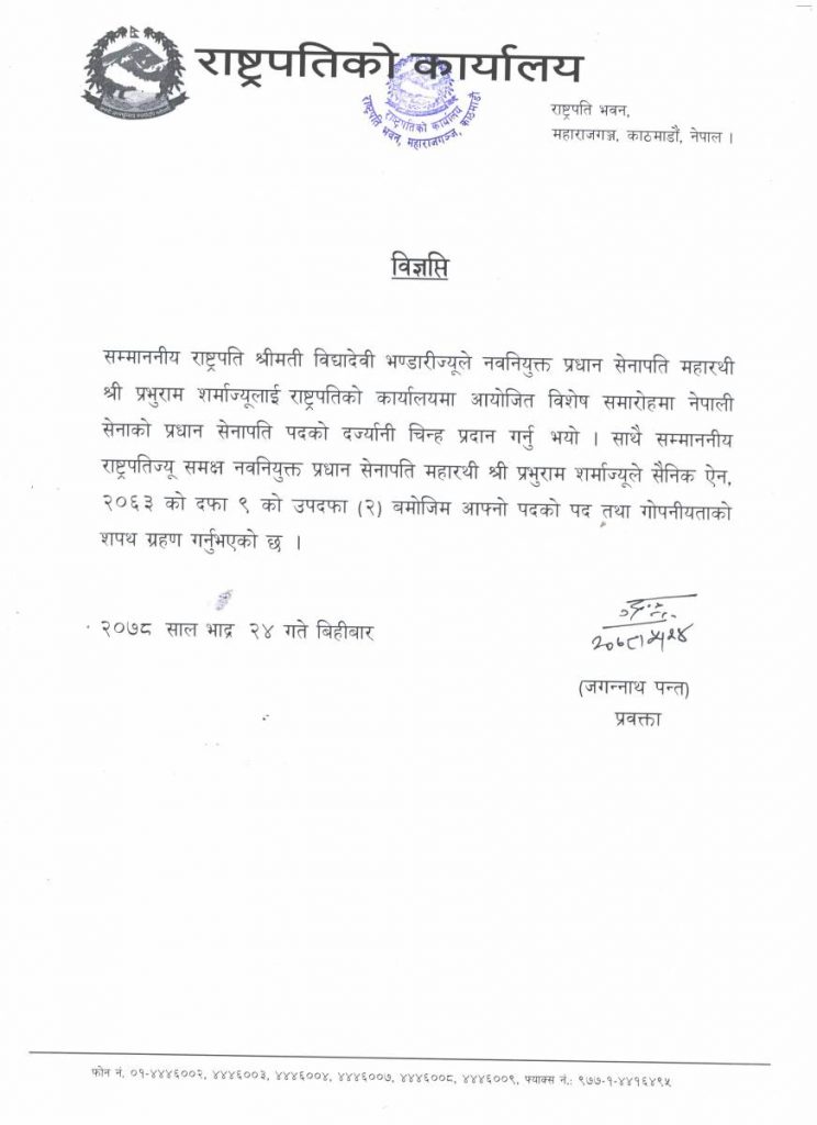 आजै पदवहाली, रथीबृन्दलाई सम्बोधन र सैनिक मञ्च टुँडिखेल र छाउनी पुगेर वीर सैनिकप्रति पुष्पहार अर्पण गर्ने नवनियुक्त प्रधानसेनापति शर्माको कार्यक्रम छ ।