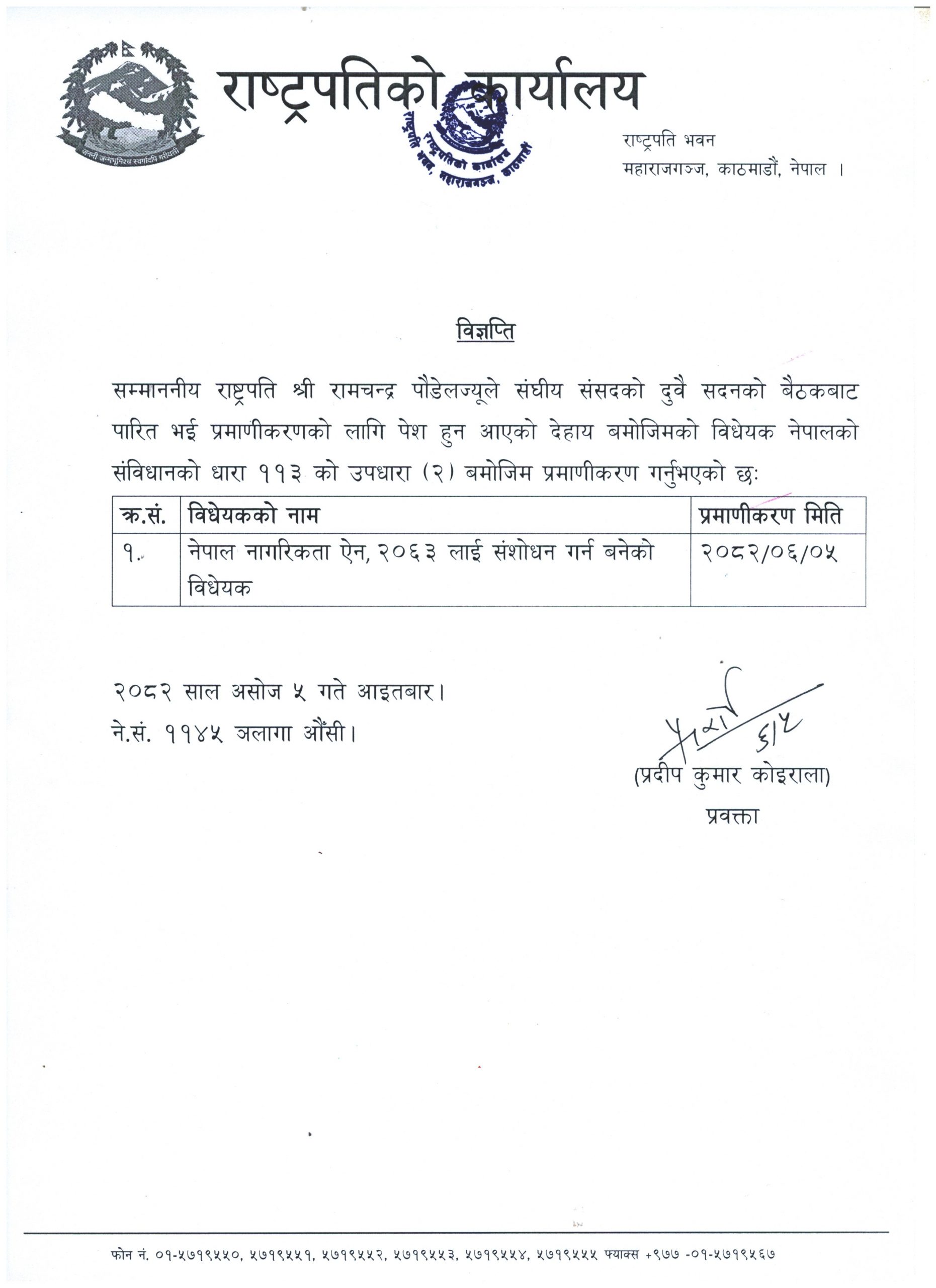 संघीय संसदको दुवै सदनबाट पारित भई प्रमाणीकरणको लागि पेश भएको उक्त विधेयक पौडेलले आज प्रमाणीकरण गरेको शीतल निवासले जनाएको छ ।