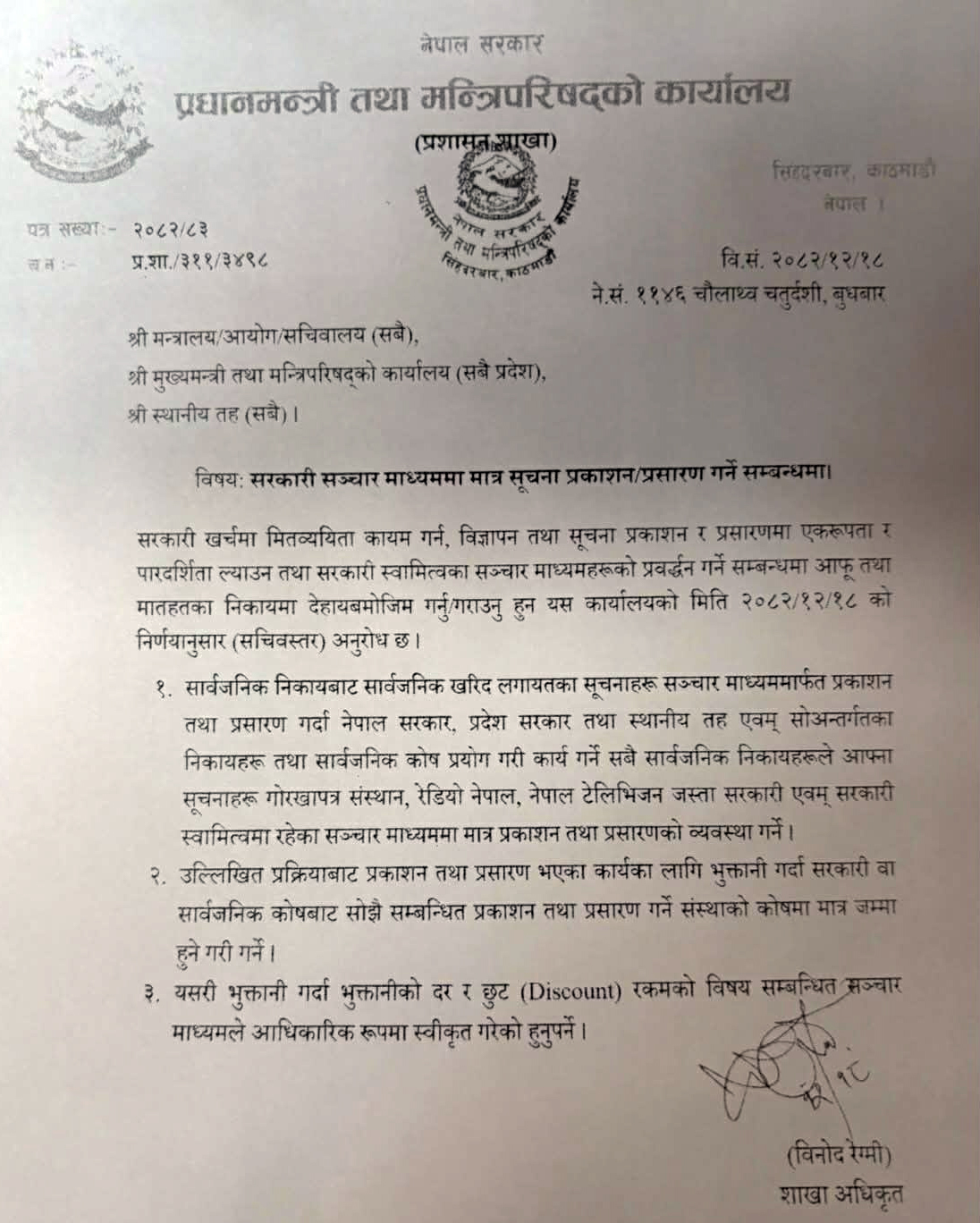 प्रधानमन्त्री तथा मन्त्रिपरिषद्को कार्यालयले बिहीबार जारी गरेको एक सूचनाअनुसार यसरी विज्ञापन दिँदा कुनै पनि तेस्रो पक्षलाई समावेश नगर्ने पनि निर्णय गरेको छ ।