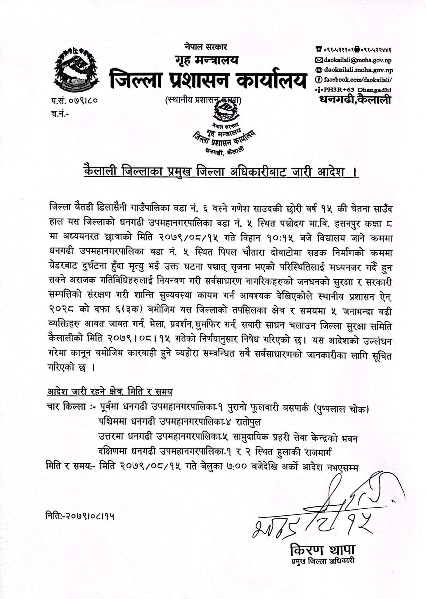 जिल्ला प्रशासन कार्यालय कैलालीले बिहीबार राति ७ बजेदेखि अर्को आदेश जारी नभएसम्मका लागि कर्फ्यू आदेश जारी गरेको छ । कैलालीका प्रमुख जिल्ला अधिकारी किरण थापाद्वारा जारी गरिएको निषेधाज्ञा प्रशासनले धनगढीको पुरानो फूलबारी बसपार्कदेखि रातो पुलसम्म तथा सामुदायिक प्रहरी केन्द्र हसनपुरदेखि वडा नम्बर १ र २ स्थित हुलाकी राजमार्गसम्म लागू गरिएको छ ।
