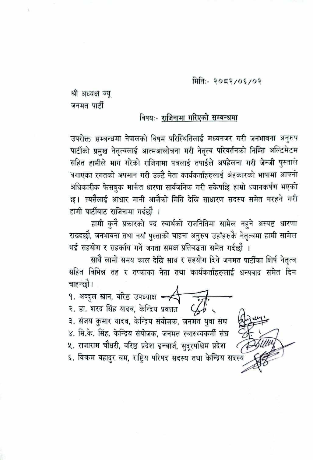 राजीनामा दिनेहरूमा जनमत पार्टीका वरिष्ठ उपाध्यक्ष अब्दुल खान, केन्द्रीय प्रवक्ता डा. शरत सिंह यादव, जनमत युवा सङ्घका केन्द्रीय संयोजक सञ्जय कुमार यादव, जनमत स्वास्थ्यकर्मी सङ्घका केन्द्रीय