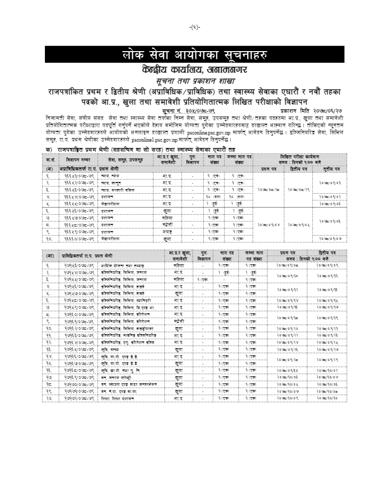 आयोगले राजपत्रांकित प्रथम र द्वितीय श्रेणी (अप्राविधिक÷प्राविधिक) तथा स्वास्थ्य सेवाका ११ औं र नवौं तहको पदको आ.प्र, खुला तथा समावेशी प्रतियोगितात्मक लिखित परीक्षाको विज्ञापन गरेको छ ।