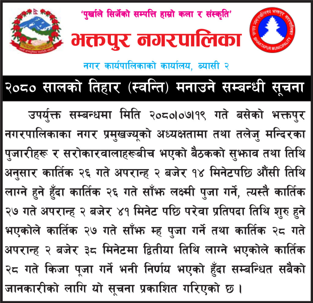 नगरपालिकाले सार्वजनिक सूचनानै जारी गरेर २७ गते म्ह पूजा र २८ गते भाइटीका मनाउन निर्देशनात्मक रुपमा आह्वान गरेको छ । यसवर्षको तिहार (स्वन्ती) मनाउने विषयमा भक्तपुर नगरपालिकाका प्रमुख सुनिल प्रजापतिको अध्यक्षतामा ज्योतिष डा वीरेन्द्रप्रसाद कायष्थ एवं ज्योतिष केदारप्रसाद दैवज्ञ, तलेजुका पुजारी प्रजेशराज राजोपाध्याय, महेश कर्माचार्य, पदमलोचन कर्माचार्यसहितको छलफलपछि यस्तो निर्णय गर्दै आफ्ना नागरिकका लागि सार्वजनिक सूचना जारी गरेको नगर प्रमुख प्रजापतिले बताए।