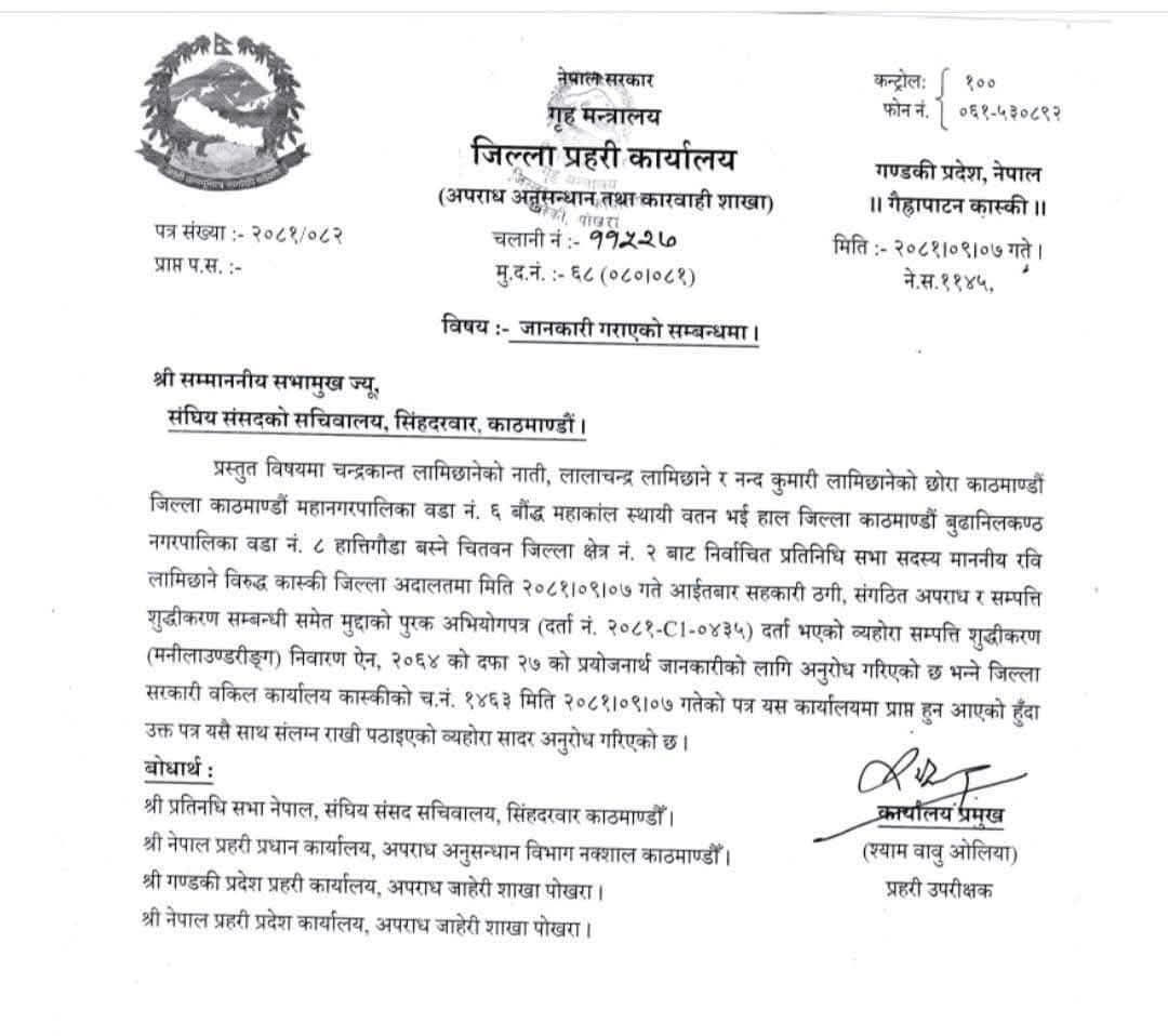 पत्रमा भनिएको छ,‘प्रस्तुत विषयमा चन्द्रकान्त लामिछानेको नाति, लालाचन्द्र लामिछाने र नन्द कुमारी लामिछानेको छोरा काठमाडौँ जिल्ला काठमाडौँ महानगरपालिका वडा नं ६ बौद्ध महाकाल स्थायी वतन भई हाल जिल्ला काठमाडौँ बुढानीलकण्ठ नगरपालिका वडा नं ८ हात्तिगौडा बस्ने चितवन जिल्ला क्षेत्र नं २ बाट निर्वाचित प्रतिनिधि सभा सदस्य माननीय रवि लामिछाने विरुद्ध कास्की जिल्ला अदालतमा मिति २०८१-०९-०७ गते आइतबार सहकारी ठगी, संगठित अपराध र सम्पत्ति शुद्धीकरण सम्बन्धी समेत मुद्दाको पुरक अभियोगपत्र (दर्ता नं २०८१–अ०४३५) दर्ता भएको ब्यहोरा सम्पत्ति शुद्धीकरण (मनी लाउण्डरिङ्ग) निवारण ऐन, २०६४ को दफा २७ को प्रयोजनार्थ जानकारीको लागि अनुरोध गरिएको छ भन्ने जिल्ला सरकारी वकिल कार्यालय कास्कीको च नं १४६३ मिति २०८१-०९-०७ गतेको पत्र यस कार्यालयमा प्राप्त हुन आएको हुँदा उक्त पत्र यसै साथ संलग्न राखी पठाइएको ब्यहोरा सादर अनुरोध गरिएको छ ।’