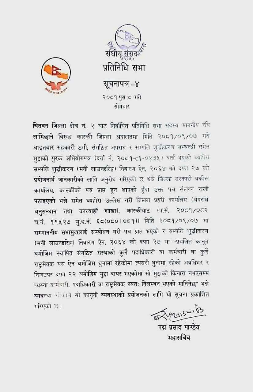 सो दफामा ‘प्रचलित कानुनबमोजिम स्थापित सङ्गठित संस्थाको कुनै पदाधिकारी वा कर्मचारी वा कुनै राष्ट्रसेवक यस ऐनबमोजिम थुनामा रहेकामा त्यसरी थुनामा रहेको अवधिभर र निजउपर दफा २२ बमोजिम मुद्दा दायर भएकामा सो मुद्दाको किनारा नभएसम्म त्यस्तो कर्मचारी, पदाधिकारी वा राष्ट्रसेवक स्वतः निलम्बन भएको मानिन्छ”, भन्ने व्यवस्था रहेको सूचनामा उल्लेख गरिएको छ । सोही कानुनी व्यवस्थाबमोजिम सूचना जारी गरिएको महासचिव पाण्डेयले उल्लेख गरे । जिल्ला प्रहरी कार्यालय कास्कीले आइतबार सभामुखलाई पत्र लेखी चितवन–२ बाट निर्वाचित प्रतिनिधिसभा सदस्य लामिछानेविरुद्ध कास्की जिल्ला अदालतमा मुद्दा दायर गरिएको जानकारी दिएको थियो ।