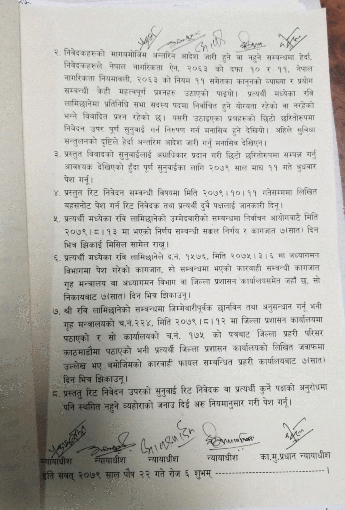 लामिछानेको उम्मेदवारीको सम्बन्धमा निर्वाचन आयोगले मंसिर १३ मा गरेको निर्णयको सक्कल फाइल पनि सात दिनभित्र झिकाएर मिसिलमा सामेल गर्न संवैधानिक इजलासले भनेको छ।