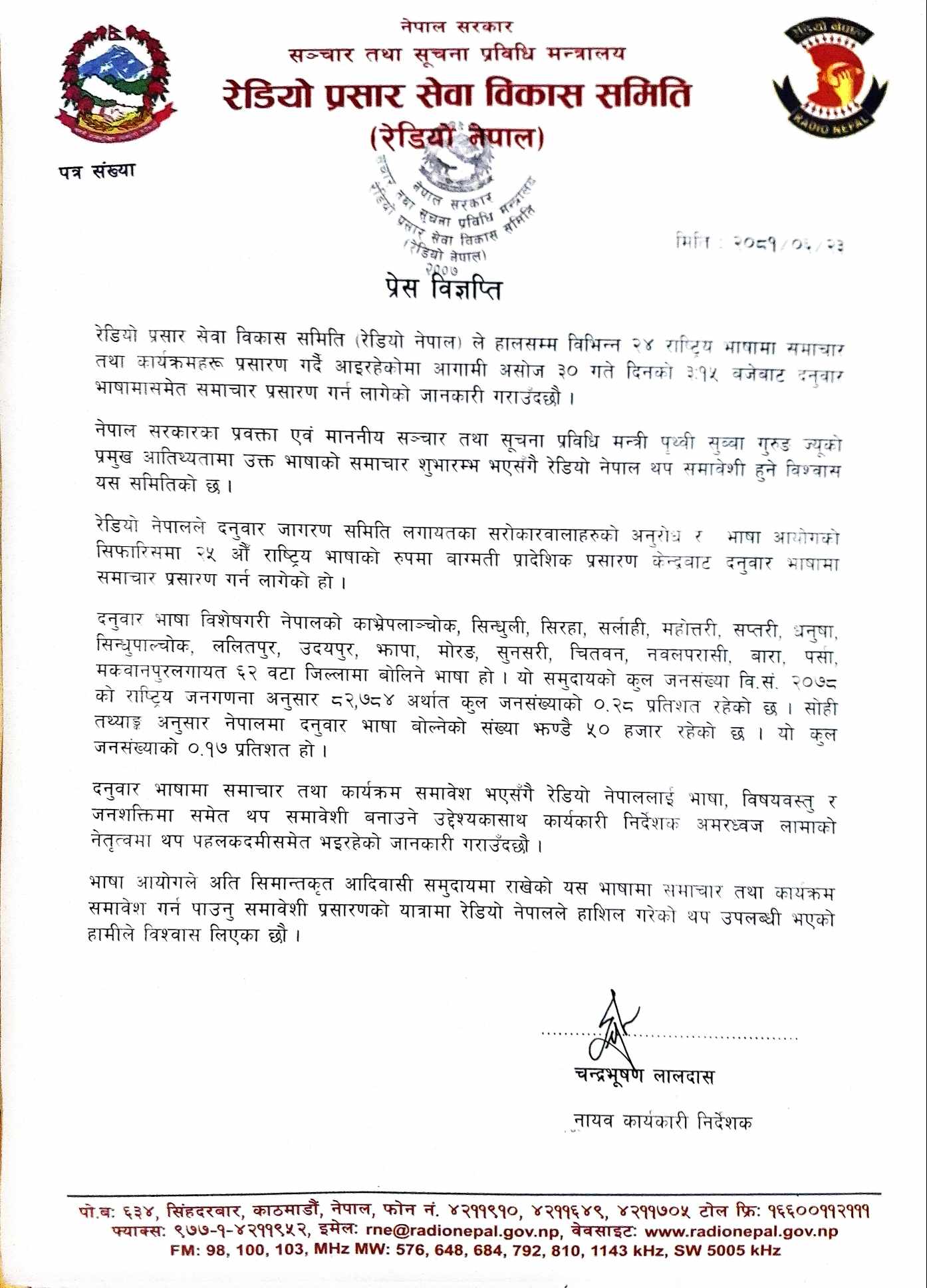 रेडियो नेपालले दनुवार जागरण समिति लगायतका सरोकारवालाहरुको अनुरोध र भाषा आयोगको सिफारिसमा २५औँ राष्ट्रिय भाषाको रुपमा बाग्मती प्रादेशिक प्रसारण केन्द्रबाट दनुवार भाषामा समाचार प्रसारण गर्न लागेको रेडियो नेपालका नायव कार्यकारी निर्देशक चन्द्र भूषण दासले जानकारी दिए ।
